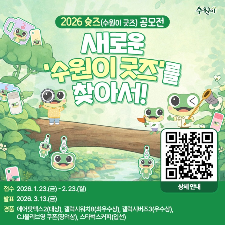안녕하세요 여러분 미대편입창조 강남캠퍼스입니다 오늘은 수원시 대표 캐릭터 수원이 굿즈 디자인 공모전을 소개할게요 ○공모전명 수원시 대표 캐릭터 수원이 굿즈 디자인 공모전 ○참가자격 대한민국 국민 누구나 ○접수기간 2026.1.23(금)~2026.2.23(월) 18시까지 ○수상작 발표 2026. 3. 13.(금) *수원이 SNS 채널 게시 ○참여대상 대한민국 국민 누구나 ○신청방법 이메일 접수(suwonigoods@yjfactory.com) ○제출서류 - 참가신청서 - 저작권 등에 대한 동의서 - 개인정보관련 동의서 - 디자인 원본파일 (PSD 파일 또는 AI파일과 JPG 파일) (디자인 원본파일을 제외한 서류는 구글 드라이브를 통해 다운로드 후 작성) https://drive.google....... <img src="https://blogthumb.pstatic.net/MjAyNjAyMjJfMjE1/MDAxNzcxNzMxODY5NDcy.w0qfCLHvumyn7DQvOvmZRI0zMcCy5nMg3aXQuWl_APUg.o2kpj0mrOk-Z0b9xVfNmDKfTMtxRh91rFM286t6eu0sg.JPEG/202602110049044904241.jpg?type=s3" />
