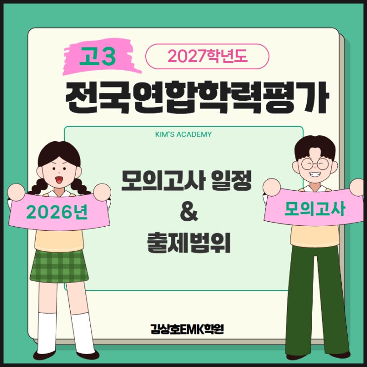 안녕하세요. 압구정 수능 지존, 김상호 EMK 학원입니다. 고1, 고2 전국연합학력평가 일정에 이어 이제 가장 중요한 고3 모의고사 일정 및 전략을 정리해 드리겠습니다. 고3의 모의고사는 더 이상 '연습'이 아닙니다. 모든 시험이 곧 수능의 축소판이자 실전 리허설이죠. 특히 3월, 6월, 9월 모의고사는 현재 위치를 점검하는 시험이 아니라, 지원 가능 대학의 윤곽이 드러나ㅣ는 시험인데요. 지금부터의 모의고사는 '성적 확인'이 아니라 합격 가능성 관리의 시작입니다. 고3 2027학년도 (2026년) 전국연합학력평가 연간 일정 출제 범위는 교육과정 순서에 의한 최종 단원을 나타내며, 처음부터 누적임 출제 과목 및 범위는....... <img src="https://blogthumb.pstatic.net/MjAyNjAyMTJfOTYg/MDAxNzcwODk5NTMzMjY2.o2hZNaDzm1ddWrCfaSWGBYqL8jOsGNY15hLgFsJmtR8g.KmG1-mVt0NVwymYal5kqb7VyOropMBi2whM9FLnND4cg.JPEG/2026_%B8%F0%C0%C7%B0%ED%BB%E7_%C0%CF%C1%A4_%281%29.jpg?type=s3" />