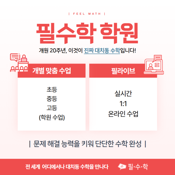 안녕하세요. 대치동 필수학학원입니다. 어느덧 필수학학원이 개원 20주년을 맞았습니다. 지난 20년 동안 한결같이 지켜온 원칙은 단 하나, ✔ “학생 한명 한명을 정확하게 책임지는 수학 교육” 이었습니다. 필수학학원이 20년 동안 사랑받아온 이유 대치동 필수학학원은 단순 문제풀이가 아닌, 학생의 수준·목표·성향까지 반영한 맞춤형 수학교육으로 많은 학부모님들의 신뢰를 받아왔습니다. 1:1·소수정예 집중 시스템 학생 개개인에게 집중할수 있는 구조로 설계된 수업 운영 대치동식 체계적 커리큘럼 내신·수능뿐 아니라 사고력, 심화수업까지 이어지는 단계별 프로그램 학습관리 & 실시간 피드백 부족한 부....... <img src="https://blogthumb.pstatic.net/MjAyNTExMjVfMiAg/MDAxNzY0MDY3ODg5MTIz.zX0ld7BmCCKK9p8aevDUnNG_tL_7xgObpx1x1TxKwOog.NHhI3EZldgvx4w-kYVBKXgkEuXl7lU3QcEAFsf7EHxAg.PNG/KakaoTalk_20251125_175240365.png?type=s3" />