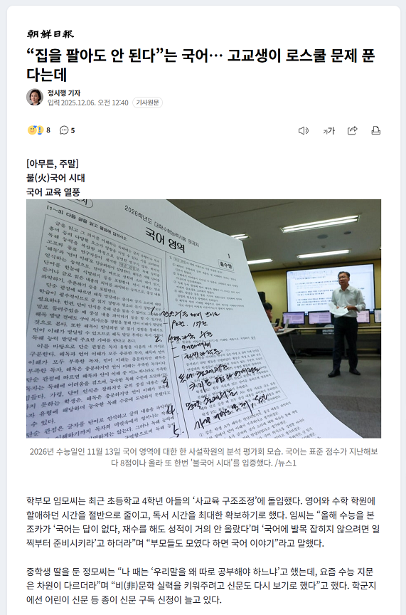 2025년 12월 6일 조선일보에 “집을 팔아도 안 된다”는 국어… 고교생이 로스쿨 문제를 푼다는 기사가 보도되었습니다. '불(火)국어 시대'라는 표현처럼 이제 국어는 단순히 문학 작품을 감상하는 수준을 넘어섰습니다. 철학·법학·경제·과학을 넘나드는 고난도 비문학과 복합 지문이 등장하며 최상위권을 가르는 입시의 가장 강력한 핵심 경쟁력이자 중심 과목이 되었습니다. 이러한 흐름속에서 발빠른 학부모님들께선 퓰리처 수업의 목표와 지향점을 알아보시고 많이 찾아주고 계신데요, 고등학교에 올라가서 급하게 수능 국어를 붙잡는 것이 아니라, 초등·중등 때부터 국어 영재 프로그램인 퓰리처 국어 논술을 통해 국어의 기초 체....... <img src="https://blogthumb.pstatic.net/MjAyNTEyMDZfODMg/MDAxNzY1MDIxMDU1Mzc5.YQirtFlU6XIiS1W1RidDbxXk19iVZapeEnzlFBmhiYMg.7kvQUlKu607yObYhoJetKAv4OYKfdNzqCzg_4iCWQ8Yg.PNG/image.png?type=s3" />