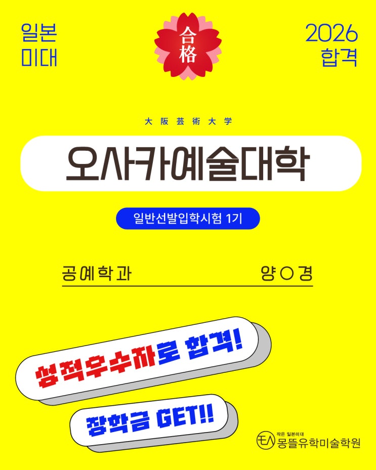 12월에는 기쁜 소식이 계속 이어지고 있습니다~ ^^♪ 여러분 안녕하세요! 일본미대 입시 전문 몽뜰유학미술학원입니다. 이번 몽뜰 블로그에서는 오사카예술대학 일반선발 1기 성적우수 합격소식 을 전해드립니다!^^ 2026년도 오사카예술대학 일반선발 입학시험 1기 공예학과 - 양○경 성적우수자 합격 신입생 장학금 GET !! 우리 친구가 무려 성적우수자로 합격하여 《 신입생 장학금 30만엔 》 을 받게 되었습니다!! (짝짝짝!!!!!) 오사카예술대학은 일본 칸사이(관서)지방을 대표하는 예술대학입니다. 미술이나 디자인 뿐만 아니라, 애니메이션, 캐릭터디자인, 영화, 문예, 방송, 음악, 연주, 무대예술까지 다양한 학과에서 공부가 가능한 예술....... <img src="https://blogthumb.pstatic.net/MjAyNTEyMTBfMTM3/MDAxNzY1MzM5MjIwMjg5.Jpk4Q8rm76DmtZp1XZvWYLLHO9jIk5OcjgOfV7oz-20g.vYtWreyKFxlyzddM5QRUSINaet0A4VH_3_nifatZgakg.JPEG/26_17.jpg?type=s3" />