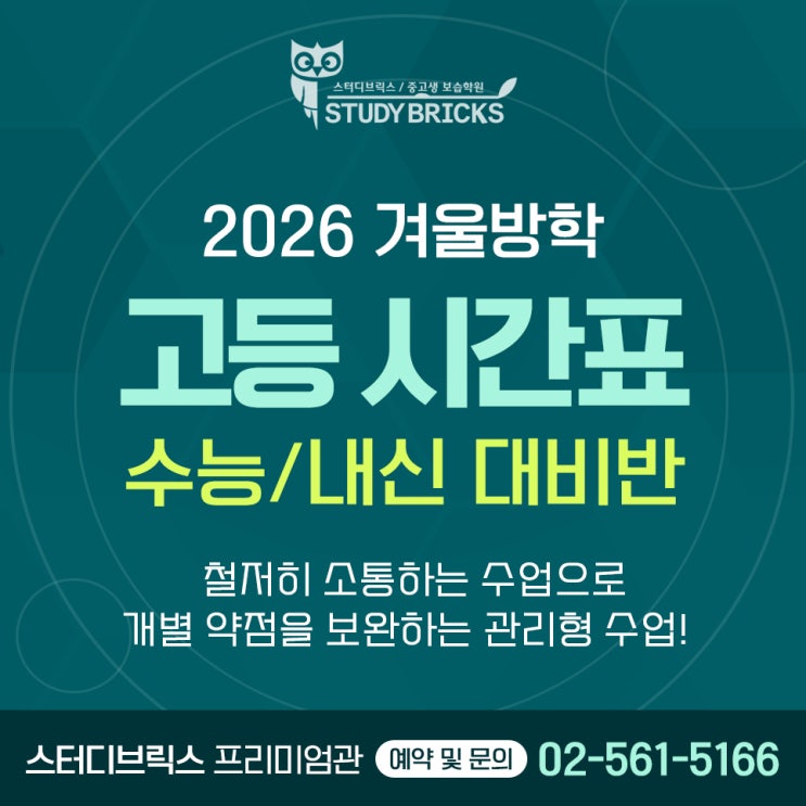스터디브릭스 프리미엄관 - 2026 겨울방학 고등 시간표 - 안녕하세요, 스터디브릭스 프리미엄관입니다 2026 겨울방학 고등 시간표를 안내드립니다. 수능 대비 학습 집중 강화 내신부터 논술까지 전략적 설계 개인 성향 맞춤 관리 시스템 운영 예비 고1·2·3의 겨울은, ‘선택’이 아닌 ‘전환점’입니다. 지금의 겨울이 내신을 만들고, 수능을 바꾸고, 대학을 결정합니다. 스터디브릭스만의 검증된 수업과 철저한 관리로 학생의 성장을 확실하게 이끌어드리겠습니다. 삼성로 317, 우석빌딩 3층 02-561-5166 / 010-7474-5166 상세 시간표는 아래 표를 확인해주세요! (정원 마감 전 서둘러 주세요!) <img src="https://blogthumb.pstatic.net/MjAyNTEyMTBfMjM2/MDAxNzY1MzUzNjcyNjQ2.jZpOf8HKvAprkqaqdPA9AMmGJl5vbI08RhiT-QQb7Xcg.RziBxdRyxLQ0lDAlNsTphkv-oplw2oCuTO1SDkQwbzUg.JPEG/251202_26%B0%DC%BF%EF%B9%E6%C7%D0_%B0%ED%B5%EE.jpg?type=s3" />