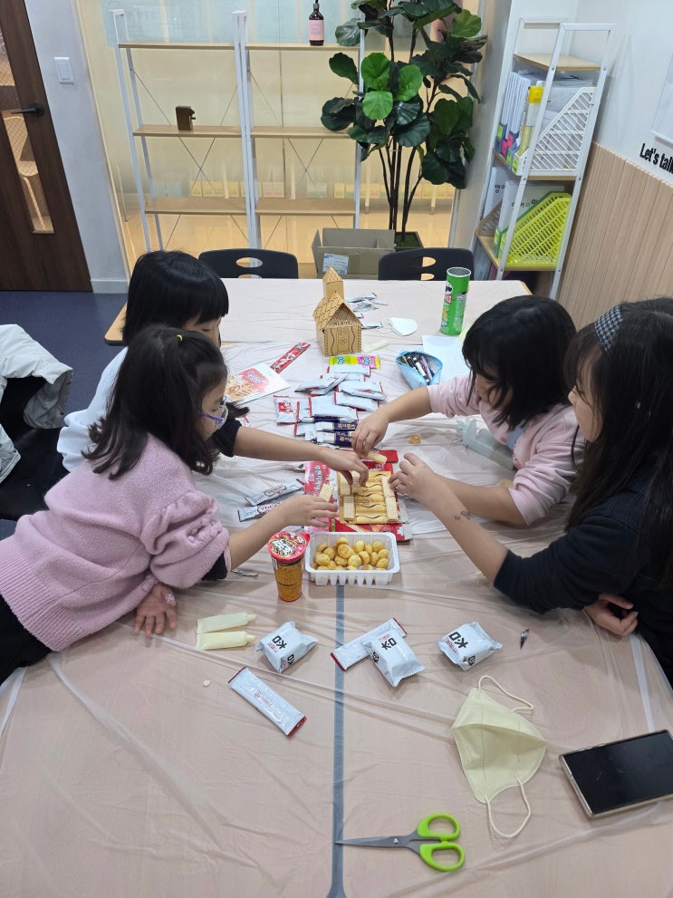 영어의아침 크리스마스 이벤트 – 쿠키하우스 만들기 체험수업 크리스마스를 맞아 영어의아침 초등부에서는 조금 특별한 수업을 진행했습니다. 바로 ‘쿠키하우스 만들기’ 크리스마스 이벤트 수업입니다 아이들이 함께 모여 과자와 크림을 이용해 하나의 집을 완성하는 활동으로, 단순한 만들기를 넘어 협력, 소통, 집중력, 그리고 성취감까지 함께 경험하는 시간이었습니다. “이거 여기 붙이면 될까?” “조금 더 눌러야 안 떨어질 것 같아!” 아이들은 자연스럽게 서로 상의하고, 도와주고, 기다려주면서 하나의 결과물을 만들어 갔습니다. 누가 시키지 않아도 “이건 내가 할게”, “이건 네가 붙여봐” 하며 자연스럽....... <img src="https://blogthumb.pstatic.net/MjAyNTEyMjRfOTcg/MDAxNzY2NTM3MTk5NTkz.giEXOyXOqNew13V1I5Aj2ZAZUF2eIjDES0s5fAY_jYUg.L5Q5Ax0Er6IIw16W4Yrt--azyBQg_I6_ZqBFfCArgrIg.JPEG/20251223_141505.jpg?type=s3" />