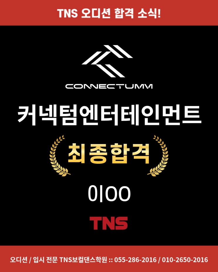 안녕하세요! 창원 중앙동에 위치한 오디션 전문학원 TNS보컬댄스학원입니다!! 여러분 오늘 저희가 포스팅할 소식은 바로 TNS보컬댄스학원 오디션합격 소식입니다!! 이번에는 과연 어느기획사에 오디션 합격하였는지 바로 알아보시죠!! 커넥텀엔터테인먼트 최종합격 #커넥텀엔터테인먼트 TNS보컬댄스학원 이OO 소속생이 커넥텀엔터테인먼트에 #최종합격 을 하였습니다!! 최종합격한 이OO 소속생 이렇게 최종합격까지!!! 정말 축하드립니다~~!! 데뷔까지 파이팅입니다!!! 최종합격 말고도 1차합격도 정말 많았는데요!! S2엔터테인먼트 1차 합격 12월 5일 금요일 오후 6시30분 창원TNS에서 진행된 #S2엔터테인먼트 내방오디션에서 김OO 소속생이 #1차....... <img src="https://blogthumb.pstatic.net/MjAyNTEyMjZfMTgw/MDAxNzY2NzI5NzcxODc2.rjWKsihzMBuXzs_3jIRewDQg8xvgVd4XJlqiOx7Eehsg.dsQaKDjrq0d3E-pwLNfalP6xysHHSZAxO5au7MzR5DIg.PNG/KakaoTalk_20251223_142520921.png?type=s3" />