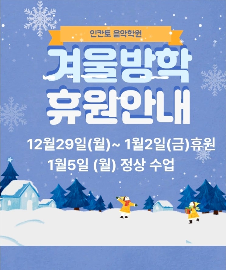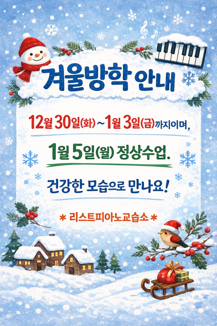 안녕하세요~ 리스트피아노교습소입니다. 어느덧 하얀 눈송이가 반가운 완연한 겨울입니다. 우리 아이들의 웃음소리와 피아노 선율로 가득했던 학원에도 잠시 쉬어가는 여백의 시간이 찾아왔습니다. 올 한 해도 쉼 없이 건반 위를 달려온 우리 아이들을 위해, 짧지만 포근한 겨울방학 소식을 전해드립니다. ️ 겨울방학 안내 12월30일(화) ~ 1월 3일(금) 이번 방학은 4일간의 짧은 휴식이지만, 우리 아이들에게는 단순한 쉼 그 이상의 의미가 되길 바랍니다. 잠시 악보를 내려놓고 가족들과 따뜻한 코코아 한 잔 나누며 마음을 채우는 시간, 그리고 다가올 새해를 향해 기분 좋게 새로운 도전을 꿈꾸는 소중한 충전의 시간이 되었으면 좋....... <img src="https://blogthumb.pstatic.net/MjAyNTEyMjhfNjgg/MDAxNzY2OTIyMTIwNTU2.4jBU_0625_FTuffaXVUQVJHf4PjrL_bhVTlePP5qMKsg.x5n-CtoaEFhMB68cEZsrVbMJkZ-ySo8PHndzd1bvyeAg.PNG/900%A3%DFfile%A3%DF0000000079f87209988603dc82eaa949.png?type=s3" />