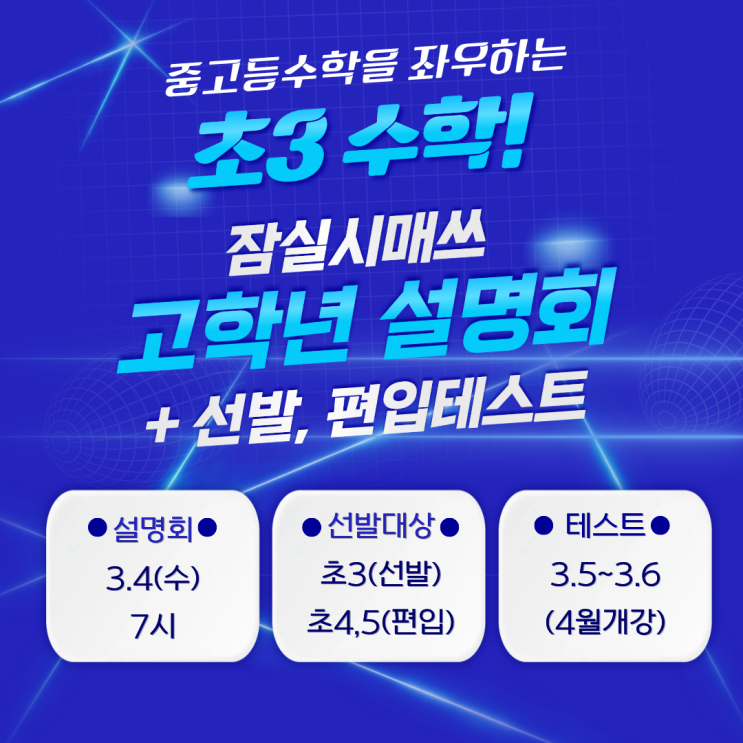 잠실시매쓰 고학년 과정은 초등 4학년 과정을 시작하여 사고력 및 교과개념, 응용, 심화 학습과 기프티드 과정을 병행하여 학습량을 늘리고 깊이 있고 폭 넓은 수학적 사고력으로 차별화된 심화사고력학습, 속진학습을 진행하나가는 과정입니다. 학습 난이도가 높아지고 중요한 초3부터 도약할 수 있는 계기가 될수 있도록 하며 선행을 위해 유형화된 문제풀이 학습이 아니라 서술 능력을 기반으로 하는 꼼꼼하고 탄탄한 진짜 실력을 쌓아갑니다. ✅영재통합반 설명회✅ *일정* 3.4(수) 7시~8시 *대상* 선발테스트에 관심, 참여한 학부모님 시매쓰 고학년과정에 관심있으신 학부모님 *참석예약* https://pf.kakao.com/_pxcxaEK ✅영재통합반 선발....... <img src="https://blogthumb.pstatic.net/MjAyNjAyMTlfMjEy/MDAxNzcxNTEwMzY0Njcy.-CKrSjWPZGAc8kHJVgMZT4nsADlOOuZ143NRPVfOm2Qg.uSVIW1Se4I_ACVIuPq9Bu45qcJjjmqp193S41CdzgBkg.PNG/%C1%A6%B8%F1%C0%BB_%C0%D4%B7%C2%C7%D8%C1%D6%BC%BC%BF%E4._%2818%29.png?type=s3" />