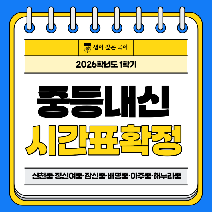 안녕하세요, 샘이깊은국어학원입니다. 다가오는 2026학년도 1학기 중등부 내신 시간표가 확정되어 안내드립니다. 이번 학기에는 학교별 지필고사 일정과 출판사에 맞춘 맞춤형 커리큘럼으로 진행됩니다. 특히 1학년의 경우 자유학기제 운영 방식에 따라 학교별로 강의 성격이 다르니 아래 상세 시간표를 꼭 확인해 주세요! 신천중1 토 저녁 5:30-8:30 (*1학기 지필고사 미시행으로, 수능기초독해력반 개강) 신천중2 토 오전: 10:00-13:00 / 일 오후 2:00-5:00 신천중3 토 오후 2:00-5:00 / 일 저녁 5:30-8:30 정신여중1 일 저녁 5:30-8:30 (*1학기 지필고사 미시행으로, 수능기초독해력반 개강) 정신여중2 토 오전: 10:00-13:00 / 일 오후 2:00-5....... <img src="https://blogthumb.pstatic.net/MjAyNjAyMTRfMjAy/MDAxNzcxMDM5MTk5NTI2.wzse_58huzksYX-KcI6nzVi6YzKeZC_ufs9TRUfVXM8g.Rt3FwLa5NDidrZ8rTkXEtBlcKkeayzQG3tYFlwU_AoAg.PNG/1.png?type=s3" />