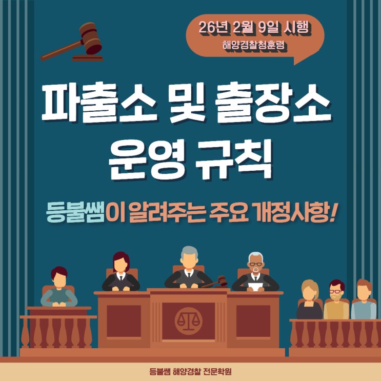 ※ '등불 수강생'분들은 [등불학원 사이트 - 해양경찰학개론(강의)]에서 '추가강의 및 첨부자료(인쇄)' 확인이 바로 가능합니다! 2026 개정 「파출소 및 출장소 운영 규칙」 완전 정리 등불쌤 추가강의 & 교재(첨부자료) 업로드 완료! 2026년 2월 9일 시행된 「파출소 및 출장소 운영 규칙」 일부개정(해양경찰청훈령) 이번 개정은 단순한 제도 보완이 아닌, 현장 안전 확보 복무관리 체계 강화 지휘 책임 명확화 재발 방지 중심의 구조적 정비 를 핵심으로 이루어진 매우 중요한 개정입니다. 개정 배경 해양경찰청은 인천 영흥도에서 발생한 해양경찰관 순직 사고를 계기로 파출소 복무....... <img src="https://blogthumb.pstatic.net/MjAyNjAyMTFfMTEz/MDAxNzcwODA5NjQxMzgy.rPMrCaUnXf-c75AKoqt4hi57Vy8QVT8h07RTqb31eEcg.PTdi4n1htLk-bDp0jNirB9aQhOlgAcPdx1XUfU4rpYog.JPEG/%B5%EE%BA%D2%C7%D0%BF%F8-%C3%DF%B0%A1%C0%DA%B7%E1_%C6%C4%C3%E2%BC%D2%B9%D7%C3%E2%C0%E5%BC%D2%BF%EE%BF%B5%B1%D4%C4%A2%28260209%BD%C3%C7%E0%29_%282%29.jpg?type=s3" />