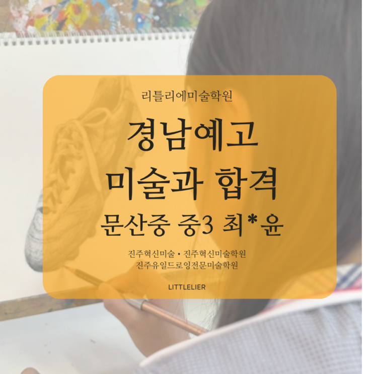 경남예술고등학교 미술과 합격, 결과는 과정에서 만들어집니다 경남예술고등학교 미술과 합격 소식을 전하게 되어 기쁩니다 하지만 이 글에서 전하고 싶은 이야기는 단순한 ‘합격’ 그 자체가 아닙니다. 이번 합격은 특별한 요령이나 단기간의 준비로 얻은 결과가 아니라, 오랜 시간 차곡차곡 쌓아온 기본기와 드로잉 중심 교육의 결과이기 때문입니다. 진주혁신미술•진주혁신미술학원•진주유일드로잉미술학원 리틀리에미술학원 처음 학원에 왔을 때, 이 학생은 그림을 좋아했지만 연습의 방향과 기준은 분명하지 않았습니다. 감각에 의존한 그림을 그리고 있었고, 실력의 기복도 있는 편이었습니다 잘 그리고 싶다는 마음은 있었지만, 무엇을....... <img src="https://blogthumb.pstatic.net/MjAyNTEyMTRfMTg5/MDAxNzY1Njg0ODIxNjc2.2o0ZslmuMMS0R7v4GpHFfI0JoRZpzb5DKbBoxxT0uRIg.C2PRxkoewiFB1kAFj8doNAn2_C6MSd4M2KLXaYrOXfUg.PNG/IMG%A3%DF2167.PNG?type=s3" />