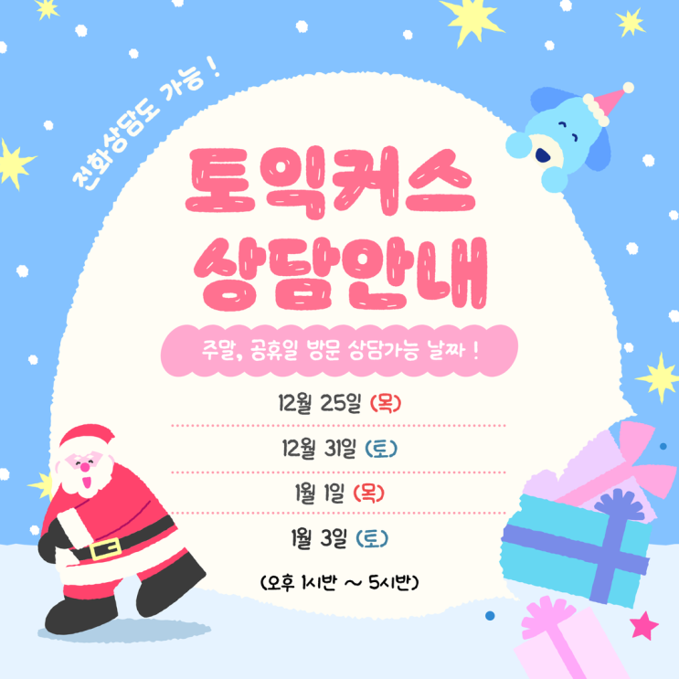 안녕하세요 토익커스입니다! 연말·연초에도 학원 상담을 희망하시는 분들을 위해 방문 상담 운영 일정 안내드립니다 아래 날짜에는 정상적으로 상담이 진행되오니 방문 상담이 필요하신 분들께서는 참고해 주세요! 방문상담 가능 주말·공휴일 날짜 ✔ 12월 25일 (목) ✔ 12월 27일 (토) ✔ 1월 1일 (목) ✔ 1월 3일 (토) ⏰ 방문상담 가능 시간 오후 1시 30분 ~ 오후 5시 30분 해당 시간 내 방문해 주시면 수강 반, 수강 과정, 일정에 대해 자세한 상담 도와드리겠습니다. 상담 안내 상담은 선착순으로 진행됩니다. 상황에 따라 대기 시간이 발생할 수 있습니다. 방문이 어려우신 경우 전화 상담도 가능합니다. 보다 원....... <img src="https://blogthumb.pstatic.net/MjAyNTEyMjJfMTMg/MDAxNzY2MzgyMzkyMzgy.E0nwsKhanqZRjQEwDGnNsV411e-1NMXjppohF6txLo4g.XGrhSD65BzI_wj2SgVy_43NmhJkqg0qj0kSXglbzBNAg.PNG/%C1%F8%C1%D6%C5%E4%C0%CD%C7%D0%BF%F8_%C5%E4%C0%CD%C4%BF%BD%BA_%B9%E6%B9%AE%BB%F3%B4%E3_%C0%CF%C1%A42.png?type=s3" />