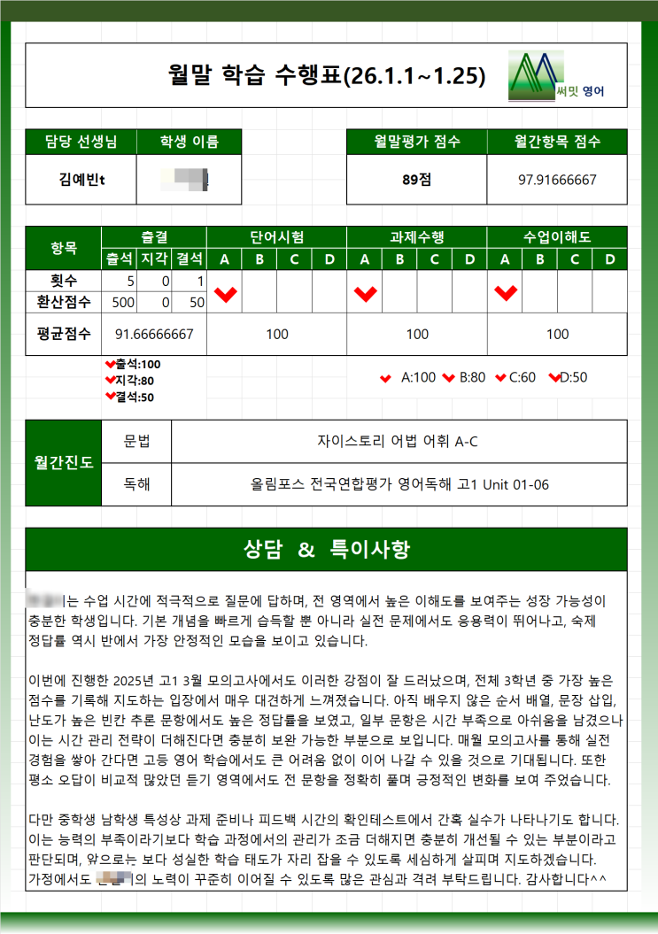 말뿐인 관리 NO! ‘데이터로 증명하는’ 써밋영어 관리 시스템 리뉴얼 안녕하세요. 강동 속의 대치, 메리트수학 x 써밋영어입니다. 요즘 상담을 하다 보면 학부모님들이 가장 많이 하시는 질문이 있습니다. “수업은 좋은데… 우리 아이가 정말 꾸준히 하고 있는지, 누가 끝까지 관리해주는지 확인할 수 있을까요?” 사실 영어는 ‘한 번 잘한다’ 보다 매일의 누적이 중요한 과목입니다. 그래서 저희는 단순히 숙제 체크로 끝나는 방식이 아니라, 학생의 학습 과정 전체를 정량적으로 확인하고 끝까지 완성시키는 시스템으로 관리 방식을 한층 더 강화했습니다. 오늘은 새롭게 업그레이드된 써밋영어의 3가지 핵심 관리 시스템을 소개드리....... <img src="https://blogthumb.pstatic.net/MjAyNjAxMjhfNzYg/MDAxNzY5NTkwODQwNjk2.zoj6auc7bIoWMXQlOAeaxVUL0vwI1qurmdog5G28yJ4g.Cwl2gQsa9F9O4Fe7d4gm-U5s_NZXSVccT1etdJoUdXIg.PNG/KakaoTalk_20260127_230857899.png?type=s3" />