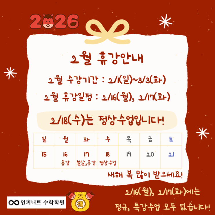 안녕하세요! 인피니트 수학학원입니다 설연휴가 있는 2월 수업기간과 휴강일정, 특강일정에 대해 안내드립니다. 꼭 확인하셔서 학습 계획에 차질 없도록 해주시기 바랍니다. 26년 2월 정규수업 일정 안내 2월 수강기간 : 2월 1일(일) ~ 3월 3일(화) 2월 휴강일 : 2월 16일(월), 2월 17일(화) *2월 18일(수)는 정상수업합니다. 휴강 사유 : 설연휴 및 수업회차 초과로 인한 휴강 *설 연휴로 인해 2월 수강기간을 3월 3일(화)까지로 조정해서 정규수업 횟수는 8회입니다! 해당 기간 수업은 모두 자동 회차조정 처리되며, 따로 보강이 진행되지 않습니다. 26년 2월 특강 일정 안내 2월 특강기간 : 2월 9일(월) ~ 3월 2일(월) *2....... <img src="https://blogthumb.pstatic.net/MjAyNjAxMjlfMTEy/MDAxNzY5NjYyNTQ3NjI2.DFHhAKx02wfm5RoTnR9IXA_TRRALNC2H5URwUydEKBcg.SJhR-iqUVelWKwO2d5XZTxjeQtJ9ny1b0MLWtvm_vZYg.PNG/%C1%A6%B8%F1%C0%BB_%C0%D4%B7%C2%C7%D8%C1%D6%BC%BC%BF%E4..png?type=s3" />