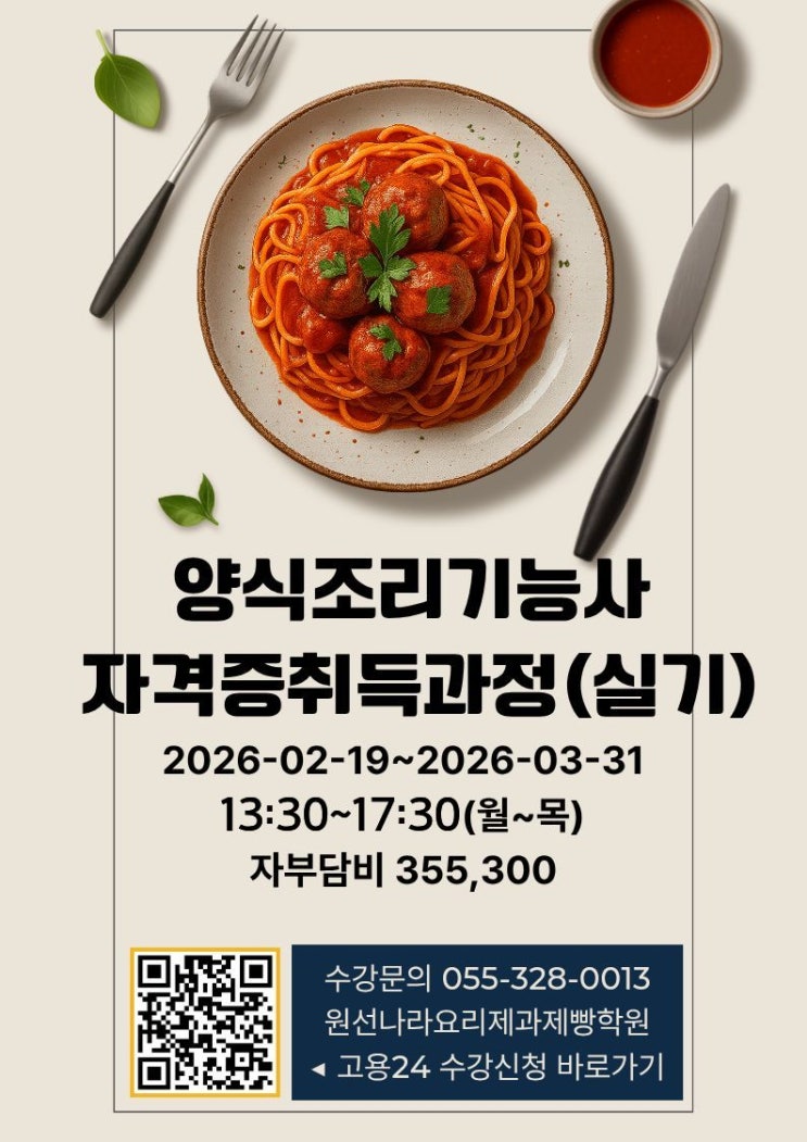 조리 국가공인자격증 양식조리기능사 과정 개강! 호텔·뷔페·파인다이닝 레스토랑 취업에 꼭 필요한 자격증으로, 양식 조리의 기본기와 실무 능력을 탄탄하게 익힐 수 있습니다. 이런 분들께 추천합니다. ✔ 호텔·레스토랑 취업을 목표로 하시는 분 ✔ 파인다이닝, 뷔페 등 양식 조리 분야에 관심 있는 분 ✔ 조리 분야 기본 자격증 취득을 원하시는 분 ✔ 조리 전공 진학 및 관련 학과 진로를 준비 중인 분 ✔ 실무 중심의 양식 조리 기초를 배우고 싶은 분 ✔ 비전공자이지만 조리 분야로 취업을 희망하시는 분 내일배움카드로 수강신청하시고, 양식조리기능사 자격증 취득으로 취업의 폭을 넓혀 보세요! 과정 개강 및 수강 문의는 언제든....... <img src="https://blogthumb.pstatic.net/MjAyNjAxMTNfNDgg/MDAxNzY4MjY1NzgwMjYw.BZnqDpCLtX4h5wfIw63CD_B-dzQLULcS9MBIgcNoaBEg.qbtGf2M1A34dm5VjevdqjxBzLb6pI7mjHRZud-CJuI8g.JPEG/%C1%A6%B8%F1%C0%BB_%C0%D4%B7%C2%C7%D8%C1%D6%BC%BC%BF%E4._%282%29.jpg?type=s3" />