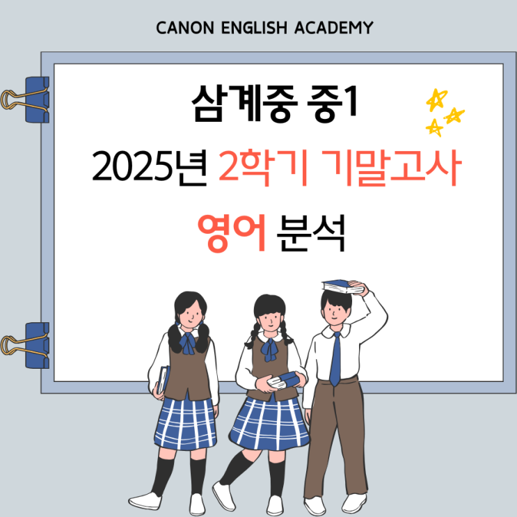 안녕하세요! 캐논쌤 입니다! 포스팅이 조금 늦었습니다. 신입생들 수업 준비하랴, 겨울방학 특별 문법 수업 준비하랴, 상담 진행 하랴, 정말 너무 바쁜 시간을 보내고 있습니다. 그러다 보니, 블로그 포스팅 횟수가 조금 뜸해진점... 죄송합니다. 그래서, 조금 밀려있는 기출 시험 분석 포스팅을 해보려고 합니다. 이번 포스팅에서는 2025년 삼계중학교 1학년 2학기 기말고사 영어 시험에 관한 포스팅을 해보도록 하겠습니다. 이번 시험은 저번 중간고사 시험 보다는 확실히 난이도가 올라간 시험 이었습니다만, 그래도, 중학교 1학년 수준에서 알아야 하는 기초 문법과, 독해 이해력을 종합적으로 평가하고 있는것을 볼 수 있습니다. 1. 시험지....... <img src="https://blogthumb.pstatic.net/MjAyNjAxMTVfMTAx/MDAxNzY4NDgzODg0OTA3.COuvTcCnX7sZZoqHwvMbtEP7jvhrAh-zXXAfeUUdOlYg.bCtHfha9tJyHO4lrPipP49YjDDSp_c0D3qk5AwvzNskg.PNG/%BB%EF%B0%E8%C1%DF.png?type=s3" />