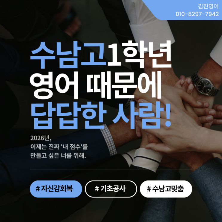 안녕하세요, 중고등 내신전문 '김진영어' 학원장 '김진영'입니다. 벌써 2026년이 시작되었습니다. 수남고등학교 입학을 앞두고 설레는 마음 한편으로, '영어'라는 큰 벽 앞에 벌써부터 숨이 턱 막히는 친구들이 있을 거예요. "중학교 때 영어를 거의 놓았는데..." "단어만 봐도 울렁거리고, 시험지 보면 다 외계어 같아요." "대형 학원에 가봤지만, 무슨 소린지 몰라 멍하니 앉아있다 와요." 괜찮습니다. 못하는 게 아니라, 아직 제대로 된 '시작점'을 못 찾은 것뿐입니다. "왜 우리 아이는 학원을 다녀도 그대로일까요?" 기초가 부족한 학생들에게 가장 독이....... <img src="https://blogthumb.pstatic.net/MjAyNjAxMTZfMTUx/MDAxNzY4NTYyNTUyOTky.Ixt1CD4ROYyKqCIwnpR8h3l2etkiC15h4D8TWymbvcYg.AxvGIH9Kq6wrsHKwtKfVMEbU5V0O4fgpNTQYIqMQzkog.PNG/1.png?type=s3" />