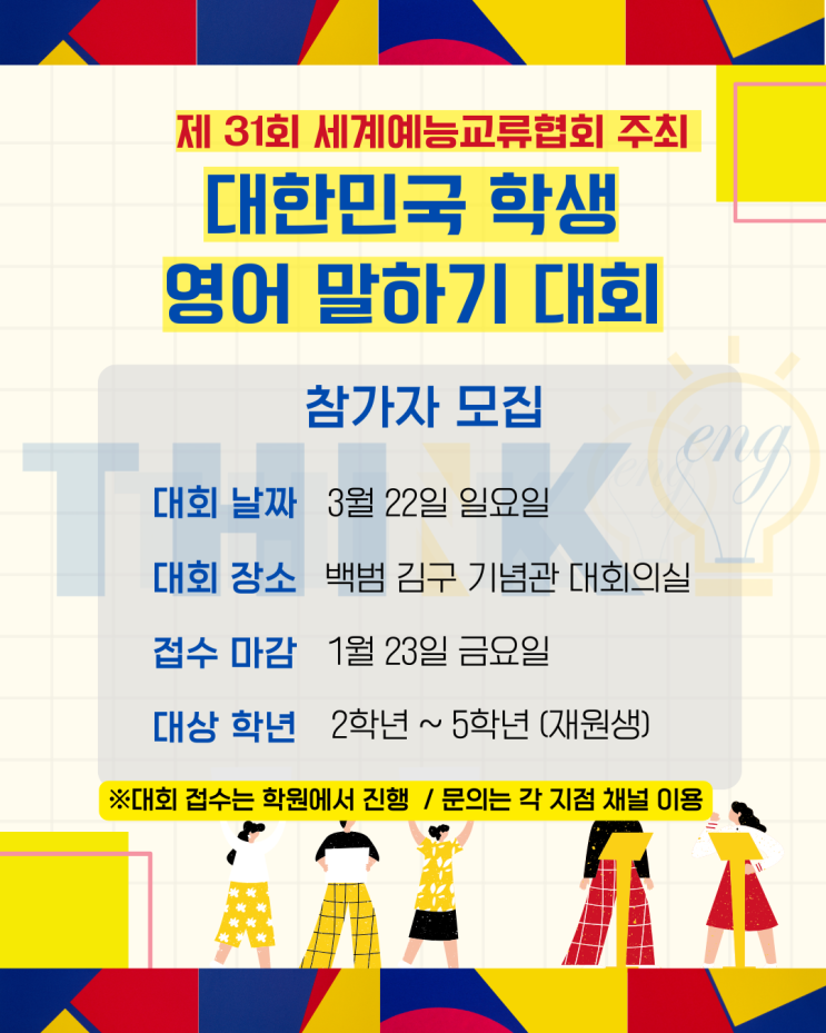 안녕하세요. 띵킹 어학원입니다 :) 세계예능교류협회에서 주관하는 제31회 대한민국 학생 영어 말하기 대회 참가자를 모집합니다. 아래 내용을 확인해 주시기 바랍니다. ■ 참가자 모집 안내 대회 날짜 3월 22일 (일요일) 대회 장소 백범 김구 대회의실 접수 마감 1월 23일 (금요일) 접수 방법 학원에서 전송된 구글폼을 통해 접수 구글폼 링크는 학원에서 일괄 발송 예정 접수는 학원에서 단체로 진행됩니다. 대상 학년 초등학교 2학년 ~ 5학년 (재원생 / 레벨 무관 / 1학년 참가 불가) ■ 대회 목적 본 대회는 자라나는 청소년들에게 영어에 대한 흥미와 관심을 갖게 하고, 대한민국의 역사와 문화를 해외에 소개하며 국제 친선 교류 증진에 기....... <img src="https://blogthumb.pstatic.net/MjAyNjAxMTZfMjY4/MDAxNzY4NTUzNjkxNzI0.1Jx2rEoxJwq_aqem4FXPodPXUKfxbovOUTXK1iHrqgkg.ZxcRoyJcrnWAw4PFlj6wtX3uFdbNoWCLScRKVsjo36sg.PNG/%BA%ED%B7%CE%B1%D7__%C1%A6_31%C8%B8_%B4%EB%C7%D1%B9%CE%B1%B9_%C7%D0%BB%FD_%BF%B5%BE%EE%B8%BB%C7%CF%B1%E2_%B4%EB%C8%B8_.png?type=s3" />