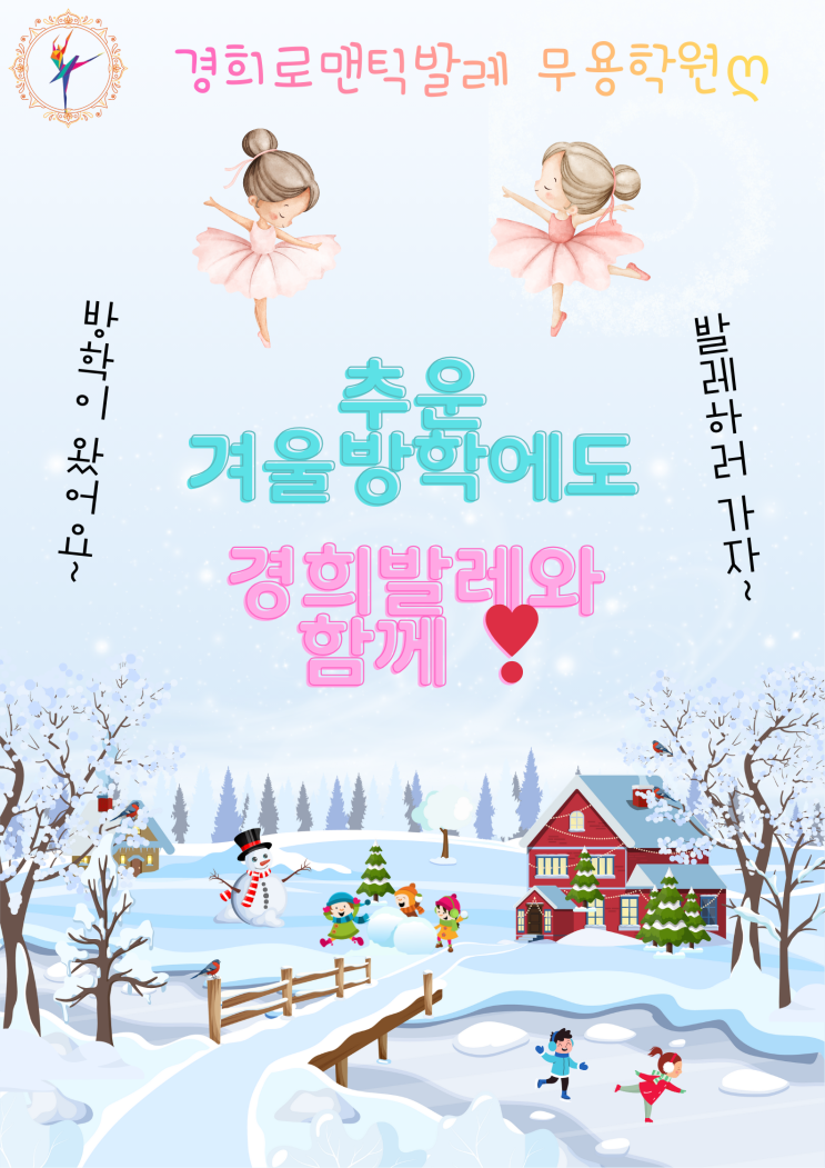 안녕하세요~ 노원발레의 중심 !! 경희로맨틱발레 무용학원입니다. 다사다난했던 2025년도 이제 열흘정도밖에 남지 않았는데 연말 각종 모임들로 인해서 불참하시는 수강생분들이 너무 많은것 같습니다 ㅠㅠ 물론!! 모두 다 이해합니다 ㅎㅎ 하지만.... 1월부터는 불참하신만큼 더욱더 힘들어 질수도 있다는사실!!! ㅎㅎ (장난입니다...하하) 다가오는 2026년 새해부터는 기존 수강생분들과 새로운 수강생들 모두 건강하게 한해를 시작하면서 열심히 2026년을 또 달려보겠습니다 !! [등록기간] 12월19일 부터 ~ 1월5일까지 [겨울방학안내] 12월29일 부터 ~ 1월3일까지 상담문의 TEL 02.934.5755 (수업중 통화가 어려우니 카카오채널 “경희무용”....... <img src="https://blogthumb.pstatic.net/MjAyNTEyMTlfMTAx/MDAxNzY2MTE1MDgwMzYz.jcxhhYdG0v41cH3pbgcIv-wCrIFpNZjrVXi3dgeI3tsg.KywBkRtgX-cnmVNIbuu6SMysb3biuqrhsW75oY-ID3Qg.PNG/%B0%E6%C8%F11%BF%F9%C6%F7%BD%BA%C5%CD.png?type=s3" />