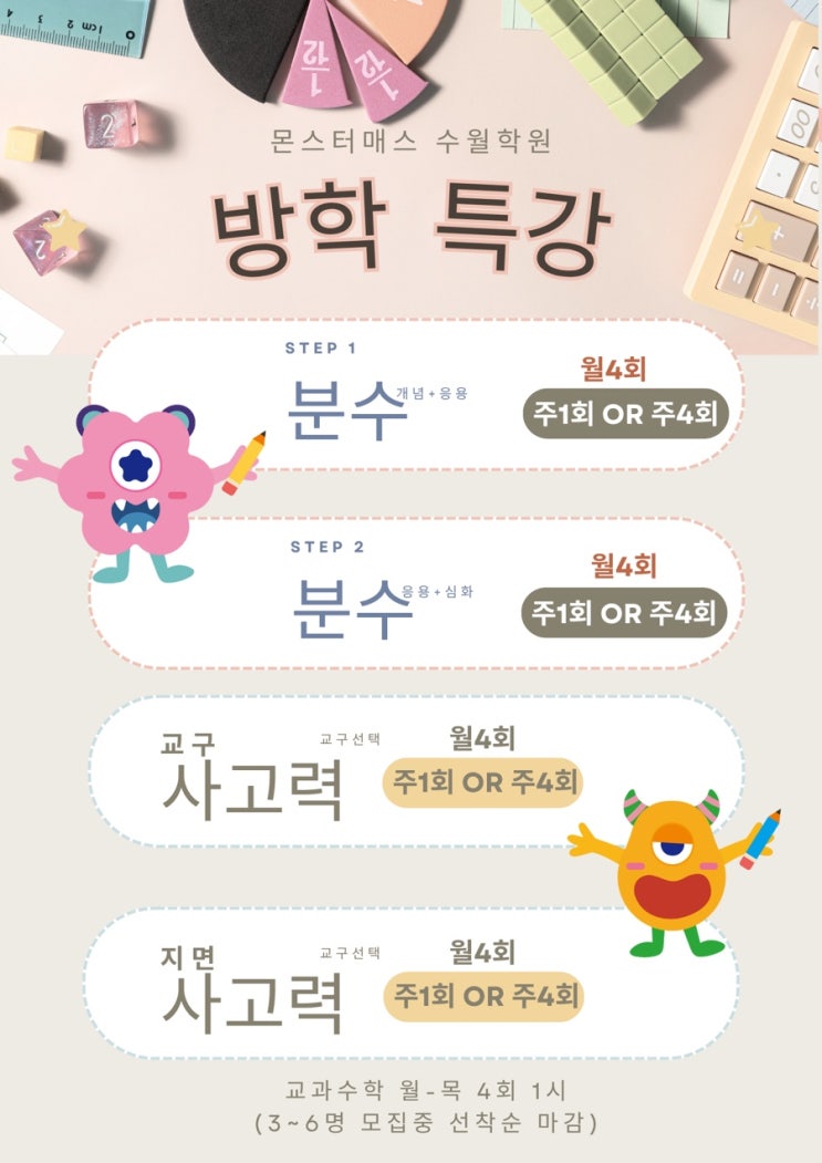 몬스터매스 수월학원의 방학특강 내용입니다 :) 방문수업, 센터수업 선택 가능합니다 아이들이 어려워하는 분수! 1학년도 2학년도 너무 쉽게 개념을 이해할 수 있는 수업이라 인기가 많아요 ☑️학원에서 정규 수업으로 진행되는 과목 연산교재와 챌린지 교재 그리고 Q교재도 센터에서 보시고 구매 가능합니다 :) <img src="https://blogthumb.pstatic.net/MjAyNTEyMTlfNTgg/MDAxNzY2MTM3Mzg5NjQ0.FGHucpwVrchrkMOESoBSZeFRTfbUTl5PdzTBSN5a2Dgg.yNyhePYGlYjSD6mARphBv2WGrW2M_xIeg2MXNJGvi2Qg.JPEG/IMG%A3%DF5593.jpg?type=s3" />
