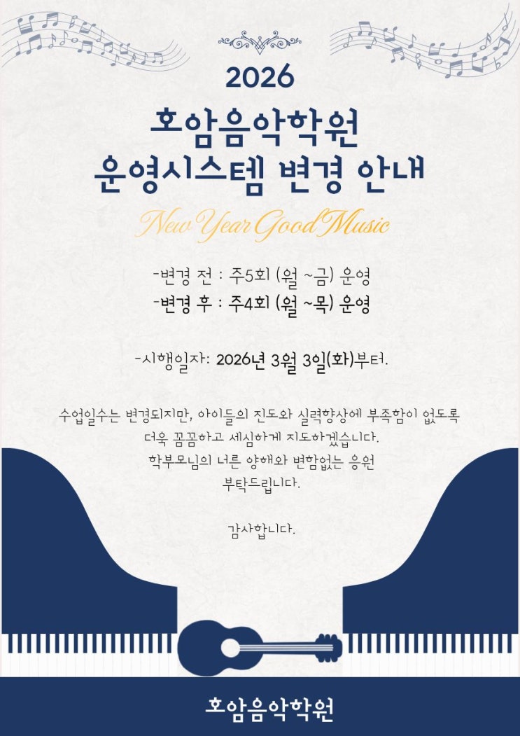 [호암음악학원 운영변경 안내] 주4회 운영