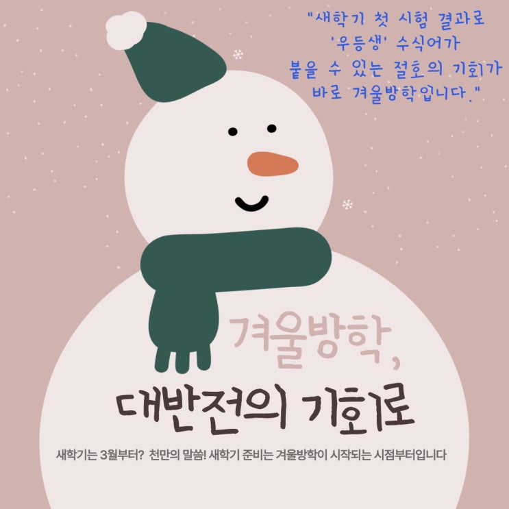 안녕하세요 미아동 수학학원 수학의힘 미아캠퍼스입니다. 사랑하는 여러분! 새학기는 3월부터? 천만의 말씀! 새학기 준비는 겨울방학이 시작되는 시점부터입니다. 새학기 첫 시험 결과로 ‘우등생’ 수식어가 붙을 수 있는 절호의 기회가 바로 겨울방학입니다. 겨울방학을 이용하여 다음 학년에 배울 기초를 공부하는 것은 새학년 우등생이 되기 위한 첫걸음이라고 할 수 있죠. 한층 업그레이드된 실력으로 2026년에는 우등생으로 거듭날 수 있도록 이번 겨울방학을 대반전의 기회로 삼아보기 바랍니다. 1. 효율적인 겨울방학 계획표 만들기 겨울방학은 추운 날씨로 인해 몸과 마음이 게을러지기 쉽다. 이런 점에서 계획표를 짜고 그에 맞춰 공부....... <img src="https://blogthumb.pstatic.net/MjAyNTEyMTZfMTA0/MDAxNzY1ODgyNTM0ODYy.jyHmHeGamcYzgwaDuRxvCg-KnYB5bXc53Sp7P-GXEoUg.fyZd6YUJUwQn2uBiVusXeSzKvIkrOeVjoX9-n8tSLPMg.JPEG/%B0%DC%BF%EF%B9%E6%C7%D0%B4%EB%B9%DD%C0%FC.jpg?type=s3" />
