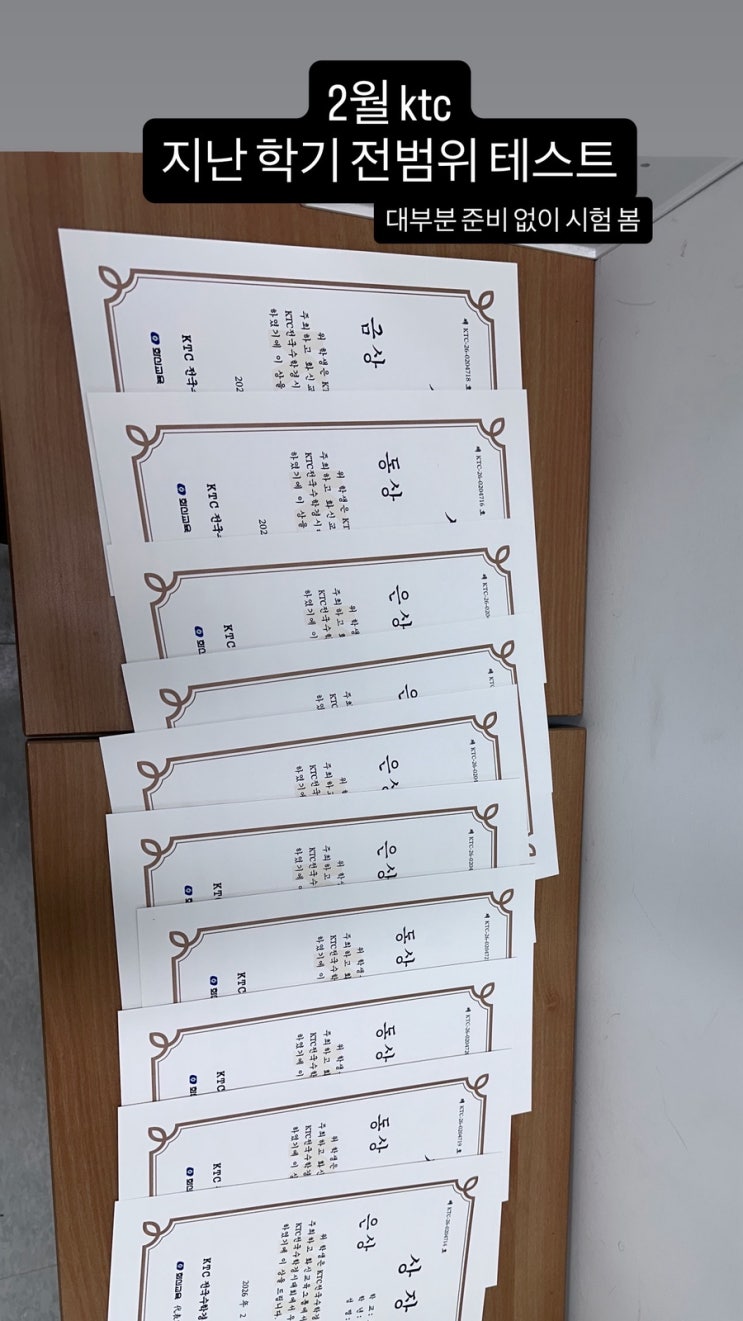 2026년 2월 KTC 2학기 전범위 테스트 대부분의 학생들 선행 진행하며, 특별히 준비 없이 본 시험. 모두 수고했다. 2026년 새학기 또 달려보자. 3월 개학하면 학교에서 볼 기초학력 진단검사. 중요헌 개념 확인하며 그동안의 학습 점검하는 시간. 태전동 와이수학 2026년 1학기 힘차게 시작합니다! <img src="https://blogthumb.pstatic.net/MjAyNjAzMDNfODkg/MDAxNzcyNTA0NjQyMTkz.vEQZ1MbCjcSe6OThRDuZFM1RPWqkiNR-xU7zHncsMuwg.rrZ2WQtRkgOSOHI1nY7ENRm3iXad3Qe2ufuszBN13gkg.JPEG/C7729498%A3%ADAABA%A3%AD41D7%A3%ADA151%A3%ADE9A02FC6A9EE.jpg?type=s3" />