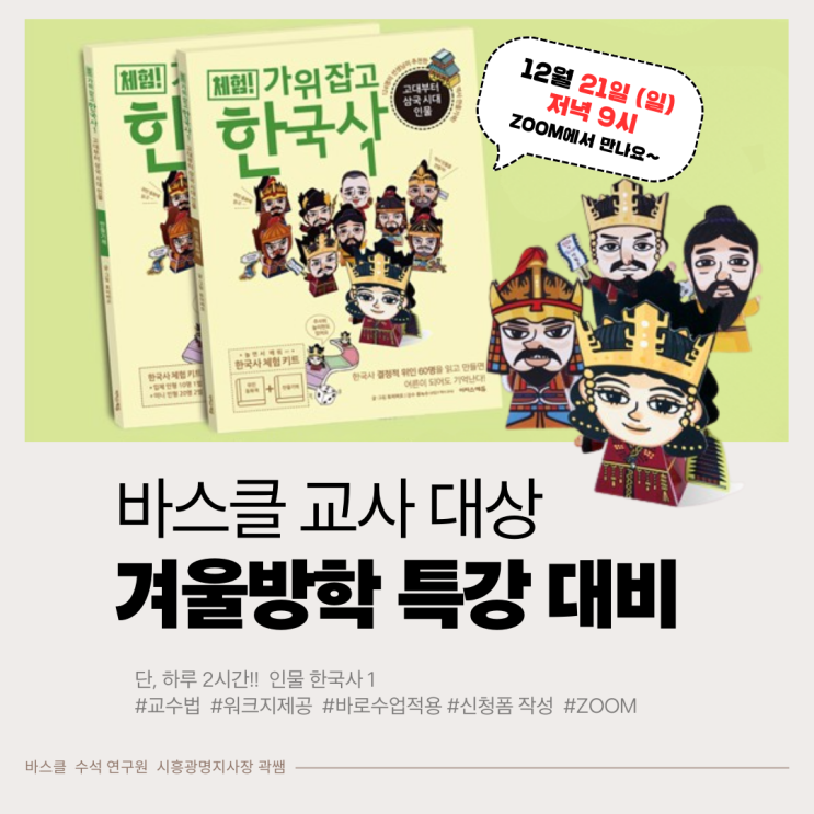 겨울방학 특강, 무엇을 준비해야 할까요? 초등 전문 바스클이 알려드리는 <가위 잡고 한국사 1> 교사 스터디 안내 겨울방학이 다가오면 많은 원장님들께서 “이번 방학 특강은 어떻게 구성해야 할까?” “저 한 년 한국사 수업을 해보고 싶은데 커리큘럼이 고민이에요” 이런 질문을 많이 주십니다. 저 역시 초등부 교육을 15년 넘게 운영하면서 방학 특강 준비는 늘 고민이 깊어지는 부분이에요. 그래서 오늘은 초등 전문학원에게 꼭 맞는 겨울방학 특강 프로그램, 그리고 원장님들이 바로 수업에 적용할 수 있도록 준비한 바빠스마트클래스(바스클) 겨울방학 대비 <가위 잡고 한국사 1> 교사 스터디를 소개해 드리려고 합니다. <....... <img src="https://blogthumb.pstatic.net/MjAyNTEyMTBfNzcg/MDAxNzY1Mzc1NDg4MTE1.lnA8k3zyhbyyPCJjv74RV2K8TyNadcZZNH3qiAGq69Mg.xRv_Rz39TALdcAbdHj4udTFRw-pNOU8ai-tLlfBgMjEg.PNG/%C1%A4%BB%E7%B0%A2_%281%29.png?type=s3" />