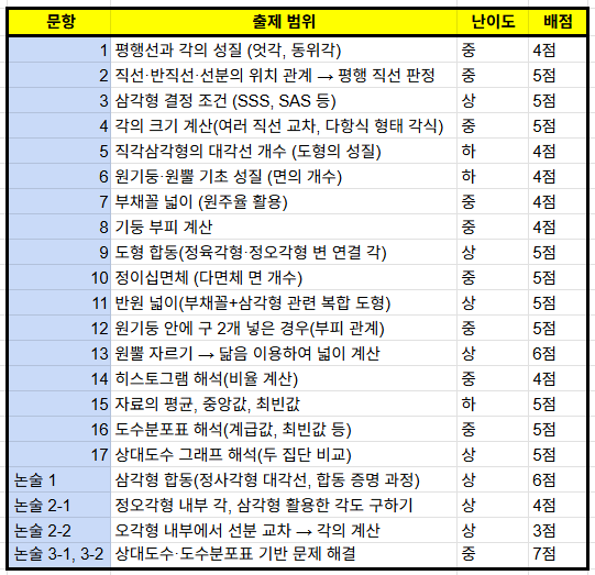 [수학 기말고사 난이도 분석 보고서] 이번 1학년 수학 기말고사 문제 구성을 난이도 기준으로 분석하여 안내드립니다. ✅ 1. 전체 난이도 총평 이번 기말고사는 전반적으로 중상 난이도로 출제되었으며, 기본 개념을 확인하는 문제부터 고난도 사고력이 필요한 문제까지 난이도 편차가 큰 시험지였습니다. 특히 중반부 이후(11번~) 문제에서 난도가 빠르게 상승하여 학생들의 사고력과 문제해결력이 확실하게 드러나는 구성입니다. ✅ 2. 구간별 난이도 분석 ① 초반 문항 (1~6번): 난이도 하~중 기초 개념 확인 문제 중심 도형의 기본 성질, 각, 평행선, 간단한 조건 해석 대부분의 학생이 해결 가능한 수준의 문제들이 배치됨 ②....... <img src="https://blogthumb.pstatic.net/MjAyNTEyMTNfMTY3/MDAxNzY1NjI1NTk2Mjc5.ZqIBcI0Pyma8_gmVfOKKTMOTikRBhFun7fPzcujdu74g.MpIb-n-stjl9sBkvfN8Ly-wSIzBmULdb21KzsRfGtsUg.PNG/KakaoTalk_20251212_185611904.png?type=s3" />