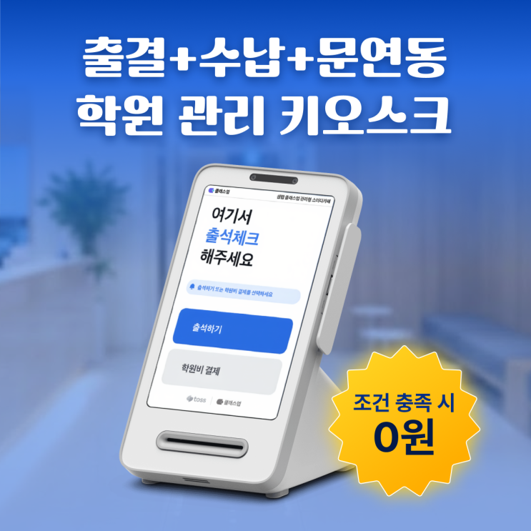안녕하세요, 스마트한 학원 운영의 동반자 클래스업입니다. 아직도 매달 비싼 렌탈료 내면서 키오스크 쓰고 계신가요? 도입하고 싶긴 한데, 비용 때문에 망설이고 계셨던 원장님도 많으실 거예요. 투박한 기계 하나 때문에 인테리어 망치고, 결국 출석만 찍거나 결제만 되는 키오스크라면… 솔직히 아쉽죠. 그래서 오늘은 출석 + 수납 + 문단속까지 한 번에 가능한 학원 전용 키오스크를 부담 없이 시작하는 방법을 소개해드리려고 합니다. 왜 강남·목동 학원들이 먼저 바꿨을까요? 출석 체크, 차원이 다릅니다 시중의 토스 단말기는 결제만 되거나 출석만 되는 경우가 대부분이죠. 하지만 클래스업과 결합된 토스 키오스크는 다릅니다. 이제 키....... <img src="https://blogthumb.pstatic.net/MjAyNTEyMTZfMjA3/MDAxNzY1ODQ1OTIwMDEz.Qg88GoEjXo9p-Re76hb1D9bbDQW965HJlQdjd1p2xXAg.1bd3_9pe62Y09EemNUUw5EYzGOEmR7IOKS4t_DhqNE0g.PNG/%C5%E4%BD%BA%C7%C1%B7%D0%C6%AE_%BA%ED%B7%CE%B1%D7_%BD%E6%B3%D7%C0%CF.png?type=s3" />