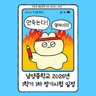 안녕하세요? 남양 카스토 영어수학입니다. 남양중학교 학부모님과 학생 여러분을 위해 2026학년도 1학기 1차 정기시험 일정 및 주요 사항을 정리해 드립니다. 1. 정기시험 개요 대상 학년: 2학년, 3학년 시험 기간: 2026년 4월 29일(수) ~ 4월 30일(목) (2일간) 시행 교과: 국어, 영어, 수학 급식 여부: 시험 기간 내 급식 실시 2. 2, 3학년 시험 시간표 2026학년도 1학기 1차 정기시험 기간 동안 1, 2교시는 자율학습으로 진행되며, 본격적인 평가는 아래 시간에 맞춰 실시됩니다. 3. 1학년 수업 일정 2026학년도 1학기 1차 정기시험 기간 동안 시험을 치르지 않는 1학년 학생들은 평소와 같이 등교하여 수업을 진행합니다. 4. 학부모님 및 학생....... <img src="https://blogthumb.pstatic.net/MjAyNjAzMjlfMjk4/MDAxNzc0NzYzODIwODc0.qItCX7MHbsg7XSfDtbBY9A0gtWE4bZfLNL2L9QV178Mg.NFJEKmHvc4diblp1MMRYIXDltO66_pTIKg2WtnwQWDkg.PNG/%C1%A6%B8%F1%C0%BB_%C0%D4%B7%C2%C7%D8%C1%D6%BC%BC%BF%E4._%2817%29.png?type=s3" />