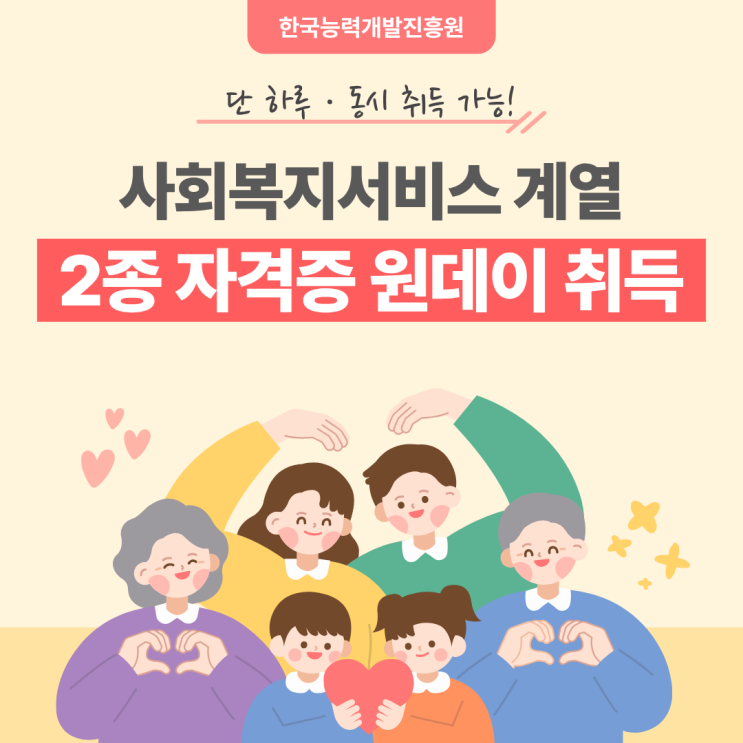 안녕하세요, 한국능력개발진흥원입니다. 2026년 1월 23일(금) 사회복지서비스 계열 2종 자격취득과정이 오픈되었습니다! 요즘 우리 사회를 둘러보면 가장 크게 느껴지는 변화 중 하나가 바로 고령 인구의 증가와 돌봄 서비스 수요 확대인데요 통계청에 따르면 2024년 65세 이상 인구는 993만 8천 명(전체의 19.2%)이며, 2025년에는 20.3%로 더 증가한 것으로 나타났습니다. 이런 변화는 곧 돌봄·동행 등 사회복지서비스 현장의 수요 증가로 이어지고 있습니다. 사회복지서비스 현장에서 활용도 높은 2종 자격증 이번에 개설된 과정은 생활지원사 + 병원동행매니저 사회복지서비스 계열에서 가장 실질적으로 활용되는 두 가지 자격증을 하루....... <img src="https://blogthumb.pstatic.net/MjAyNjAxMDdfMjUz/MDAxNzY3NzUwNDMyMzEz.2T9sjnpzAH3lkgZLPpSEjFtXcbpaKSn7Qcu_ghdYilkg.7efNGTHIvW3i3rJXK_vlxA_nc2DV-sDSJaSkvqV1q_wg.PNG/%BB%E7%C8%B8%BA%B9%C1%F6_%B4%E7%B1%D9.png?type=s3" />
