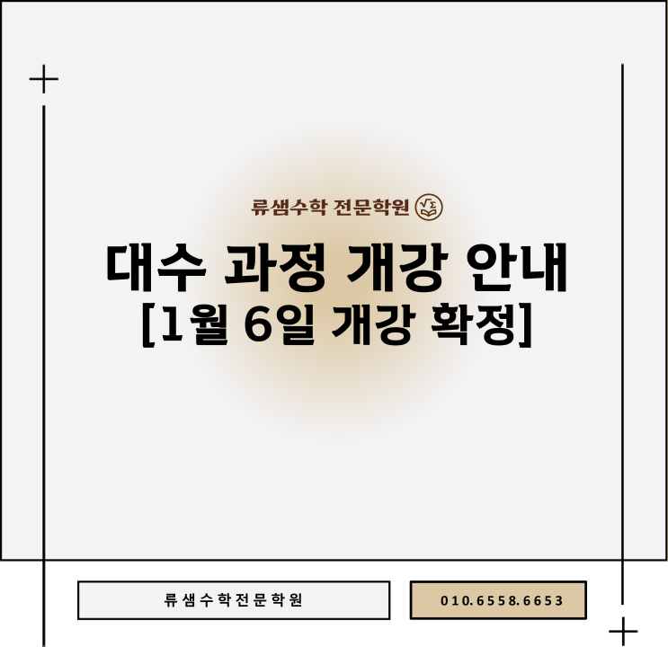 안녕하세요. 사직동 류샘수학전문학원입니다. '대수 문제풀이 과정' 개강 안내드립니다. 아래의 안내 사항을 참고 부탁드립니다. 기존 수강생이 아닌 학생들도 수강 신청 가능한 수업입니다. 입반 문의는 010-6558-6653으로 연락 부탁드립니다. 선착순 마감 예정입니다. 모집 기간 · 1월 6일 개강 확정 · 1월 6일 - 2월 29일까지 수업 (개학 주간인 2/2-2/5은 오후 6시에 수업 시작합니다. 2/7부터 방학 시간표로 다시 진행) · 1월 3일까지 신입생 모집합니다. 수강 대상 · 예비고1, 예비고2 학생 중 대수 개념서를 1회독 한 학생 · 5등급제 기준 수학 과목 2등급 이상인 학생들에게 추천합니다. · 기존 수강생이 아닌 학생들도 수강 가....... <img src="https://blogthumb.pstatic.net/MjAyNTEyMDVfMTEg/MDAxNzY0OTI0ODM3NjE4.Bbr9zBb56BYee_NFH5ELPdg1f6PTgic6pF681yO3c-Yg.sq8uHRCO60CN-NLLU1LZJpCy3W6ZemEe2GioLttTF8Eg.PNG/%B1%D7%B8%B23.png?type=s3" />