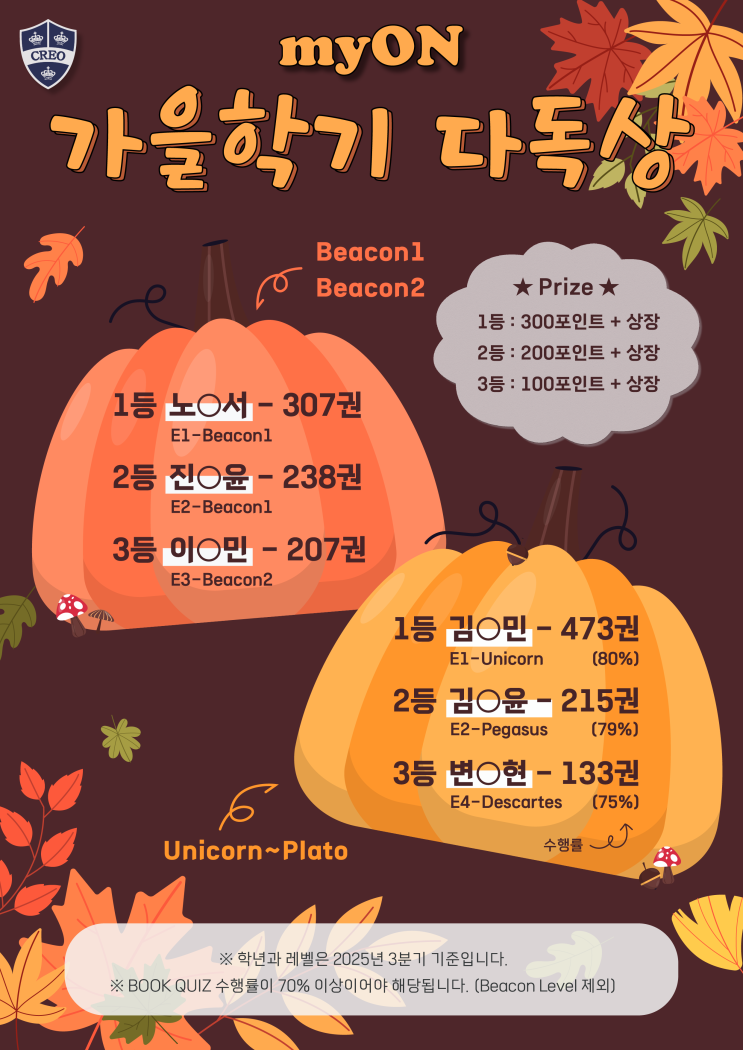 안녕하세요 CREO어학원 동래캠퍼스입니다. 이번 가을학기 myON 다독상 수상자를 발표합니다. (학년과 레벨은 2025년도 3분기 기준입니다.) ※Book Quiz 수행율이 70% 이상이어야 해당됩니다 (Beacon Level제외) ✨Beacon1,2✨ 1st 노○서 (Beacon1_E1) - 307권 2nd 진○윤 (Beacon1_E2) - 238권 3rd 이○민 (Beacon2_E3) - 207권 ✨Unicorn~Plato✨ 1st 김○민 (Unicorn_E1) - 473권 (80%) 2nd 김○윤 (Pegasus_E2) - 215권 (79%) 3rd 변○현 (Descartes_E4) - 133권 (75%) 상장 수여는 12/4(목)~12/5(금) 진행됩니다. 수상자에게 많은 칭찬과 박수 부탁드립니다. 온라인 영어 도서관 myON은 아이들의 다독을 장려하고 다양한 책을 읽....... <img src="https://blogthumb.pstatic.net/MjAyNTEyMDVfMTg1/MDAxNzY0OTA1ODQwODky.PVtIqt8GUBN_QCEMRFotwMpXtWJMEtoL45DTYaCB2esg.XzvHkLJDGMZJkX5b5DrhVJTebbbIHeENIYIRaLl35MYg.PNG/25%B3%E2_%B0%A1%C0%BB_%B4%D9%B5%B6%BB%F3%28%C0%CC%B8%A7x%29.png?type=s3" />