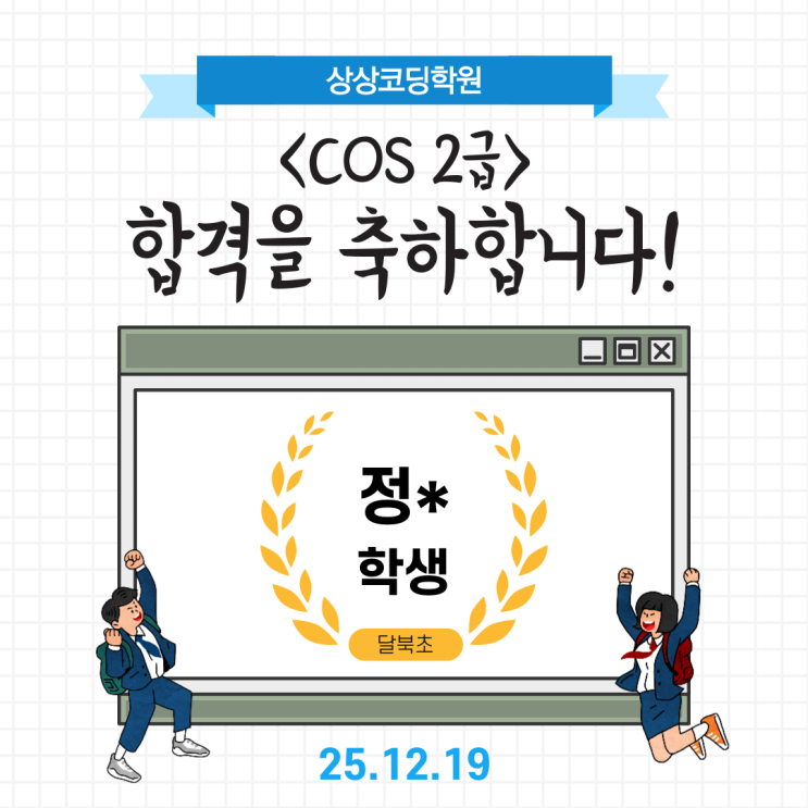 안녕하세요. 상상코딩학원입니다. 합격을 축하합니다 ^^ <img src="https://blogthumb.pstatic.net/MjAyNTEyMTlfMTU4/MDAxNzY2MTMxMzczNzg2.GjT9oz_FYYQKSZ9m46WdX5UxoyOvWsGQKeo2Qfua4xEg.257KgpdSimqDi_H8er85FRjCQ0Ml7yZSLREBxP0AE2Eg.PNG/COS_2%B1%DE_-_%C1%A4%BA%BD%28%B4%DE%BA%CF%C3%CA%29.png?type=s3" />