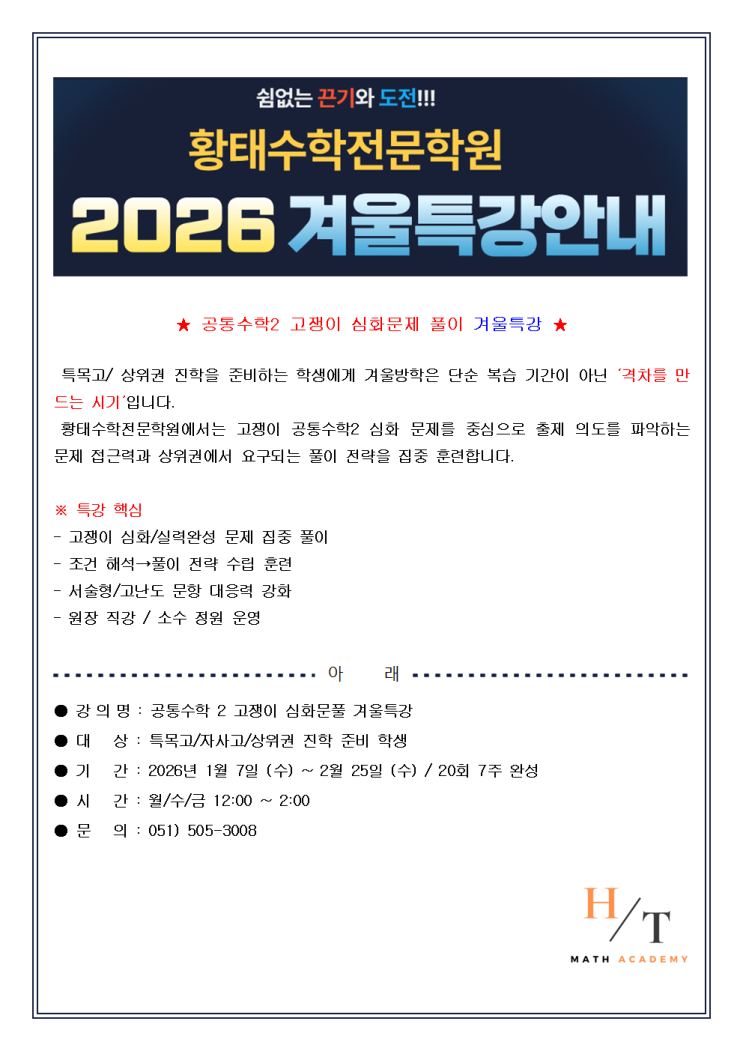특목고/ 자사고 입시에서 공통수학2 실력은 선택이 아닌 필수입니다. 단순 개념 이해로는 상위권을 절대 넘을 수 없습니다. 황태수학전문학원 겨울특강은 공통수학2 고쟁이 심화문제를 통해 출제의도를 꿰뚫는 문제 해석력, 서술형/변형 문제 대응능력, 실전에서 통하는 논리적 풀이 완성에 집중합니다. 고난도 문제 앞에서 '어디서부터 시작해야 할지 모르는 학생'과 '풀이 방향이 바로 보이는 학생'의 차이, 이번 겨울에 분명히 만들어 드립니다. 겨울방학은 실력을 뒤집을 수 있는 유일한 시간입니다. 공통수학2를 약점이 아닌 특목/자사고 대비 최강 무기로 완성하세요. 대 상 : 특목고 / 자사고 진학 목표 상위권 학생....... <img src="https://blogthumb.pstatic.net/MjAyNTEyMjJfMTYy/MDAxNzY2MzQ1NDIzMjU5.aaRJ81KpjhlbhoKHlm0_zaG3uYKGM0fmLKM1r-H71z0g.TBM--ZIgsBpOp7HyfASQmZfWPYc95rehRth02D455rYg.PNG/2026%B3%E2%B0%DC%BF%EF%C6%AF%B0%AD%BE%C8%B3%BB%B9%AE%28%B0%AD%C0%B1%BD%BD%29001.png?type=s3" />