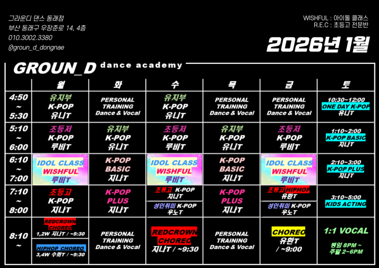 안녕하세요! #부산댄스 #동래댄스 #동래댄스학원 #그라운디댄스학원 동래점입니다. 수업안내 ⏰ 연령별 세분화 수업 <유치부/40분> 월/수 4:50 화/목 5:10 <초등 저학년/50분> 월/수/금 5:10 화/목 6:10 월/수/금 6:10 <초등 고학년 이상/50분> 월~금 7:10 수강료 <취미반> 주 1회 : 10만원 주 2회 : 15만원 주 3회 : 17만원 주 4회 : 22만원 주 5회 : 25만원 <전문반> 초등 아이돌 전문반 WISHFUL : 35만원 초등 고학년 전문반 R.E.C : 37만원 <보컬 수업> 1회 체험가 : 8만원 → 4만원 1회(외부생) : 7만원 1회(재원생) : 6만원 <개인 레슨> 1:1 K-POP : 7만원 2:1 K-POP : 8만원 1:1 CHO....... <img src="https://blogthumb.pstatic.net/MjAyNTEyMjZfMzMg/MDAxNzY2NzQyNjAxNDc5.mIRESwL4PhfXOc24niYoOlMLrdyNJslw-7nVw0xjdBYg.VsKKeM_VTeaUXbRPDbgN_cKZX2vMy1ao_xMCBQXNoZ8g.PNG/1%BF%F9_%BD%C3%B0%A3%C7%A5.png?type=s3" />