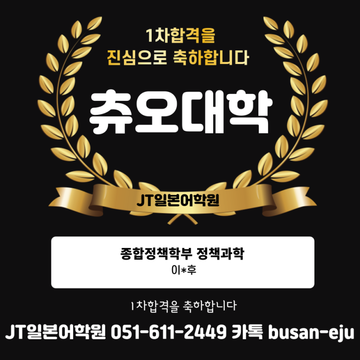 부산EJU(JT일본어학원)~ 츄오대학 종합정책학부 이*후 1차합격을 축하합니다~