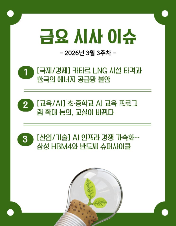[금요시사이슈] 2026년 3월 3주차 시사 브리핑 안녕하세요, 올바른 방향(Right)으로, 정직하게(Honest) 학생과 동행하는 R&H 유패스랩(U-Pass Lab) 입시컨설팅입니다. 어느덧 3월의 3주차입니다. 학기 초반의 어수선함이 가라앉고, 다가오는 중간고사 대비와 함께 이번 학기 나만의 '비교과 탐구 주제'를 확정 지어야 하는 중요한 시기입니다. 시사는 매일같이 쏟아지지만, 생활기록부에 의미 있게 남는 것은 결국 '나의 전공과 연결할 수 있는 확장 가능한 질문'입니다. 이번 주 유패스랩은 에너지 공급망, 교육 정책의 변화, 그리고 미래 AI 산업을 아우르는 핵심 이슈 3가지를 엄선했습니다. 이 뉴스들이 내 희망 전....... <img src="https://blogthumb.pstatic.net/MjAyNjAzMjBfMjcg/MDAxNzczOTY5MjQ4NzUw.MKUUPEQcxl1Tr7A9h8MFJsabf_fxYoAN4CXODKukdoAg.LtY04zqcz0-WZ4xNBh5Qvn8sxONG6TIM97GF89fodssg.JPEG/%C1%A6%B8%F1%C0%BB-%C0%D4%B7%C2%C7%D8%C1%D6%BC%BC%BF%E4_-001.jpg?type=s3" />