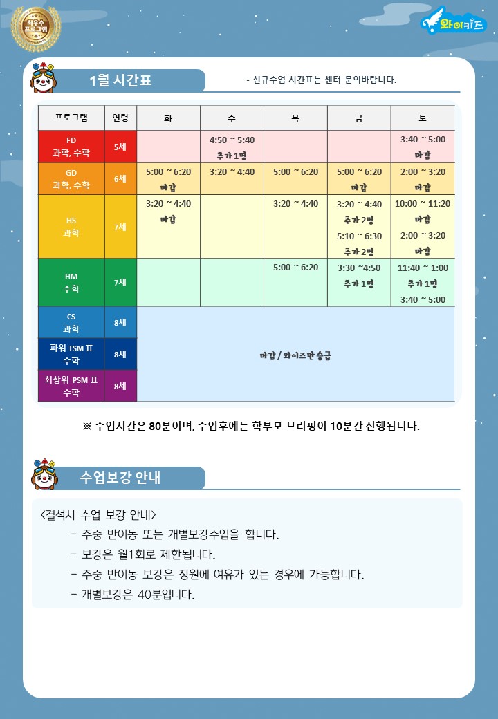 와이키즈 부산남구센터 2026년 1월 9일 현재 시간표입니다. 마감 - 정원마감 추가O명 - 추가 등록가능 인원 무표시 - 추가 등록가능 인원 3명 이상 체험 문의 : 051-623-5953 <img src="https://blogthumb.pstatic.net/MjAyNjAxMDlfMTIg/MDAxNzY3OTAyMDU5MzQ5.6X78oUVHyjXiW34Mwq06Z6qN9sYw-u26UDa4k7sgdC4g.359PmrDcHi8MjojWbVd5rJcENY-JmvoTNVQbilLIyjIg.JPEG/2026%B3%E2_1%BF%F9_%BD%C3%B0%A3%C7%A5.jpg?type=s3" />