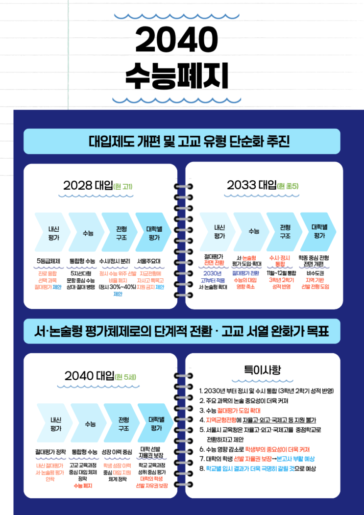 안녕하세요~ 더본 수학영어학원입니다. 2025년 12월 10일 서울시 교육청에서 미래형 대입 제도를 제안하면서 2040 대입에는 수능을 폐지해야 한다고 발표하였습니다. 이를 발표한 배경에는 미래형 대입 제도를 위해 안정적인 준비 및 체계 구축이 필요한 상태이나, 논의가 국가교육위원회 중장기 과제로 이관된 상황에서 국교위가 중장기 교육계획 발표를 번번이 미루자 제도의 조기 확정을 위한 의도가 엿보입니다. 먼저 발표 내용을 정리한 타임라인을 보시면 아래와 같습니다. 학교 교육은 '깊이 있는 학습', '사고력과 문제해결력을 평가하는 논·서술형 평가를 지향하나 수능은 지식 중심의 5지 선다 문항으로 진행되고, 대입....... <img src="https://blogthumb.pstatic.net/MjAyNTEyMTFfNDkg/MDAxNzY1NDM2NjU4MTUx.UP31JUBdMhPKrlP5mp5tjYV-qT1OT5yEvj2wAod4x74g.uf01AorPQqr0n4UztQEqvXZ96sWaZSZlGeF0tjcSkZMg.PNG/%C1%A6%B8%F1%C0%BB_%C0%D4%B7%C2%C7%D8%C1%D6%BC%BC%BF%E4..png?type=s3" />