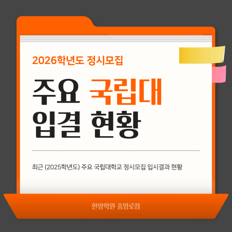 안녕하세요. 한양학원 중앙로점입니다. 오늘은 2026학년도 정시모집 원서접수를 앞두고, 각 대학들의 최근 입시결과를 찾아보는 수험생들이 많을 거라 예상돼, 한양학원 중앙로점 블로그에서 주요 국립대학교 최근 입시결과를 함께 살펴보는 시간을 갖고자 합니다. 오늘 함께 살펴볼 주요 국립대학교는 경북대학교, 부산대학교, 충남대학교 전남대학교로, 위의 대학교에 정시원서를 작성할 예정이 있는 수험생 분들은 아래의 최근 입시결과(입결) 현황표를 참고하시어 지원에 도움이 되었으면 좋겠습니다. 최근 경북대학교 2025학년도 정시모집 입시결과 현황 살펴보기 가장 먼저 살펴볼 국립대학교는 대구/경북권에 위치하고 있는 경북대학교입....... <img src="https://blogthumb.pstatic.net/MjAyNTEyMjJfMTc1/MDAxNzY2Mzc1MTcyMTc1.Sz-2a_sR0FeyITIZg364zfHYVtRmXEtCWb4Lmx-hO54g.wPrNJL2PX-RS7t7OaV68f10UwJrq0CB-k-4CZk18XMMg.PNG/%C1%A6%B8%F1%C0%BB_%C0%D4%B7%C2%C7%D8%C1%D6%BC%BC%BF%E4..png?type=s3" />