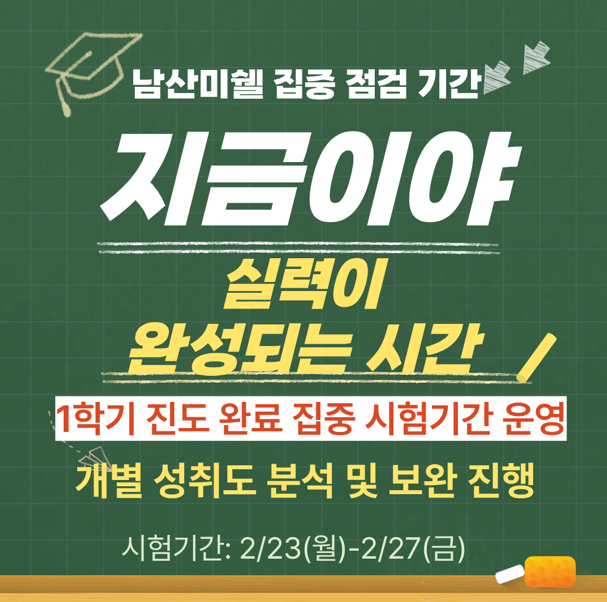 집중 점검 기간 운영 남산미쉘에서는 1학기 진도를 완료한 학생들을 대상으로 집중 점검 기간을 운영하고 있습니다. 진도를 나가는 것만큼 중요한 것은 학생이 개념을 정확히 이해하고 있는지 점검하고 부족한 부분을 보완하는 과정입니다. 이번 집중 점검 기간은 학생별 성취도를 정확히 분석하고 향후 학습 방향을 설정하기 위한 중요한 관리 과정입니다. 집중 점검 기간 운영 내용 이번 점검 기간 동안 학생들은 다음과 같은 과정을 통해 현재 실력을 객관적으로 확인하게 됩니다. ✔ 단원별 성취도 평가 ✔ 실전 적용 능력 점검 ✔ 취약 단원 집중 보완 ✔ 개별 성취도 분석 진행 학생별 학습 상태를 정확히 확인하고, 필....... <img src="https://blogthumb.pstatic.net/MjAyNjAyMjBfMTc4/MDAxNzcxNTc0NjcxMzAy.VTMK9qsMRT3LGly-cL8WLZqzL6HfMxj9LAX-LTE_cRYg.pgRpLgBh7XJBI2JfYrxYNwpn67JRSKcv-i8iZN3cF9cg.PNG/1771574636145.png?type=s3" />