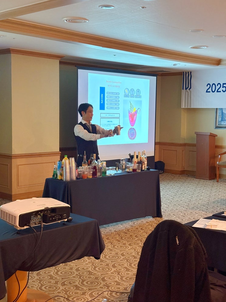 칵테일 팀빌딩] 한국기술교육 대학교 2026.02.05 교육시간 : 15:00 ~ 17:00 교육인원 : 34명 [출장강의][출장칵테일교육] 지난 2026년 2월 6일 제주도 오리엔탈 호텔에서 한국기술대학교 과정평가형 OJT 기관 멘토 워크샵에 참여하여 칵테일 팀빌딩 힐링 프로그램을 진행하였습니다. 이번 팀빌딩 칵테일 프로그램은 한국기술교육대학교분들이 함께 참여하여 서로 소통하고 단합하여 팀워크 향상을 목표로 트렌드 칵테일 및 팀미션 창작 칵테일을 완성하여 팀별 스토리텔링을 발표해보는 커리큘럼으로 구성되어있습니다. 칵테일 체험 실습에 앞서 칵테일에 관련된 간단한 주류상식과 실습시 유의사항에 대한 설명이 진행되었습니다. 다른 곳에서 보....... <img src="https://blogthumb.pstatic.net/MjAyNjAyMjBfNDAg/MDAxNzcxNTY5ODIwMDM4.PV1qwYeFQNt7wcWNVIXm9pr8mrhim60UPO1eL89DkAAg.8fo2sWsyoqdy3ZjMXHyLVEdY0NdY-g-_QXwtxYKeoZYg.JPEG/KakaoTalk_20260210_085658539.jpg?type=s3" />