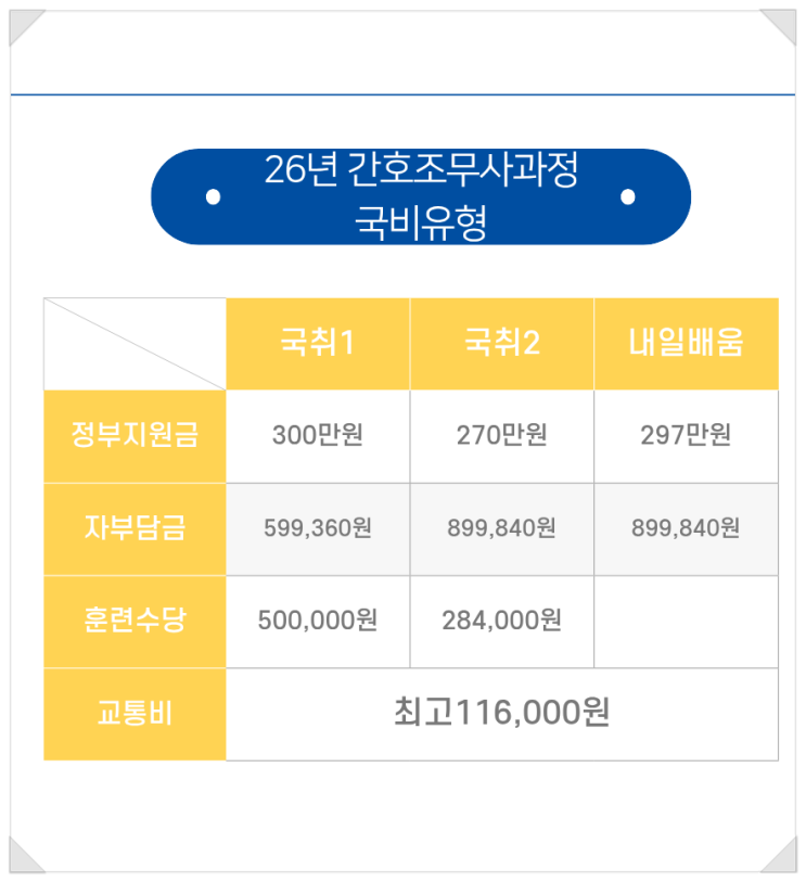 주말 지나니 바람이 꽤 차가워졌어요~ 안녕하세요 대구간호학원 동대구간호학원의 DNA예요 오늘은 2026년부터 적용될 간호조무사 국비과정 수강료에 대해 안내해드리려해요 간호조무사 국비지원 과정은 고용노동부 기준에 따라 운영되며, 훈련의 질과 안정적인 과정 운영을 위해 다음과 같은 부분이 반영되었습니다 ✔ 실습 재료 및 기자재 비용 상승 ✔ 교육 운영비 증가 ✔ 보다 안정적인 교육제공을 위한 필수 비용 발생 이에 따라 훈련과정 운영에 필요한 최소한의 범위 내에서 수강료(자부담금)가 조정되었어요 위 표에서 보여지듯이 국민취업지원제도 1유형에 해당이 되면 정부지원금이 300만원 자부담금이 599,360원 국민취업지....... <img src="https://blogthumb.pstatic.net/MjAyNTEyMjJfMjEz/MDAxNzY2Mzg0MDAxNjA2.cXw9mT-EQYTVrb9OtWgGj8p8olzSN3mIaZMXceQEsNYg.bikdAucGEdcCYRzcckwzpMSy1i3F64SQfL_TMtNFU78g.PNG/2.png?type=s3" />