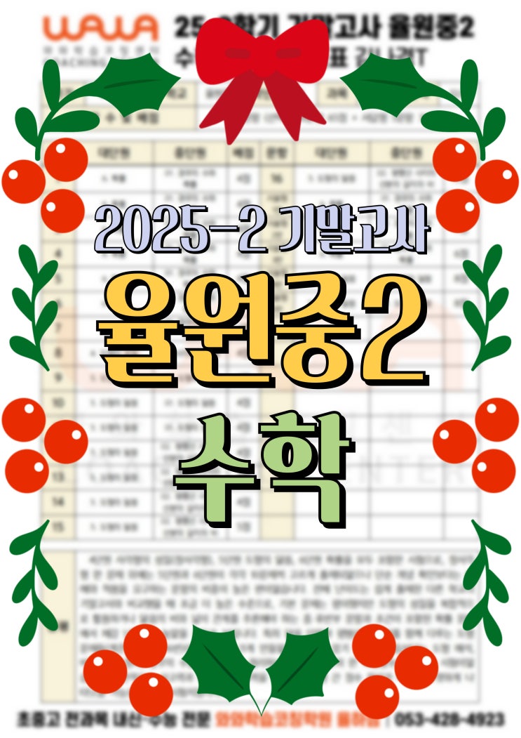 율원중학교 2학년 2학기 기말고사 수학은 단원 범위는 익숙했지만, 문제를 푸는 방식에서는 사고력과 해석력이 크게 요구된 시험이었습니다. 이번 시험은 4단원 사각형의 성질(정사각형), 5단원 도형의 닮음, 6단원 확률을 모두 포함해 출제되었으며, 정사각형 단원은 1문항, 5단원(닮음)과 6단원(확률)이 각각 10문항씩 고르게 출제되었습니다. 시험의 전체적인 특징 겉으로 보기에는 단원별로 고르게 출제된 평범한 시험처럼 보일 수 있지만, 실제 문제를 풀어본 학생들은 체감 난이도가 높았다고 느꼈을 가능성이 큽니다. 그 이유는 ✔ 단순 공식 대입으로 풀리는 문제보다 ✔ 개념을 이해한 뒤, 조건을 해석하고 적용해야 하는 문제의 비....... <img src="https://blogthumb.pstatic.net/MjAyNTEyMjNfMTg3/MDAxNzY2NDUzMjg4NDk0.pVY7rIUjHhd_6E6bU0QFcdaGwVGgCOwkQmPbHsKaj_sg.kderzTygvDbYNGXHXuL6KFpOWcfRm3MDPY3ohw2vY0Eg.JPEG/%BD%C3%C7%E8%C1%F6-%BA%D0%BC%AE%C7%A5-001.jpg?type=s3" />