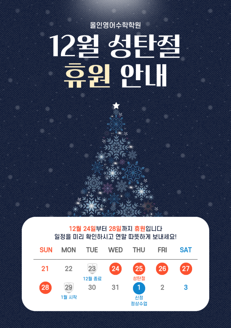 안녕하세요, 학부모님. 대구 동구 신서동 올인영어수학학원 원장입니다. 먼저, 2025년 한 해 동안 학부모님들의 깊은 신뢰와 성원에 진심으로 감사드립니다. 아이들이 올인영어수학학원에서 학습의 즐거움을 느끼며 한 단계 더 성장할 수 있도록 격려해주신 점에 대해 감사드립니다. [휴원 및 보강일] 학원 겨울방학 : 12월 24일(수)~28일(일) 다가오는 새해에도 올인영어수학학원은 아이들이 기초를 탄탄히 다지고 스스로 학습 목표를 달성해 나갈 수 있도록 교육에 최선을 다하겠습니다. 추운 날씨에 건강 유의하시고, 사랑과 행복이 가득한 연말 보내시길 바랍니다. 가정에 평안이 가득하시고 새해 복 많이 받으십시오. 감사합니다. <img src="https://blogthumb.pstatic.net/MjAyNTEyMjNfMjAz/MDAxNzY2NDYxODA2ODUz.-CjOXu2DTpFaTw0XoUK28vcyF6E_m7vjIueTlMV0anMg.K0Y6VRpgL-VdDs0KCJlIKhxZfHxbl6wp9zk2q7KFJtEg.PNG/%C5%A9%B8%AE%BD%BA%B8%B6%BD%BA.png?type=s3" />