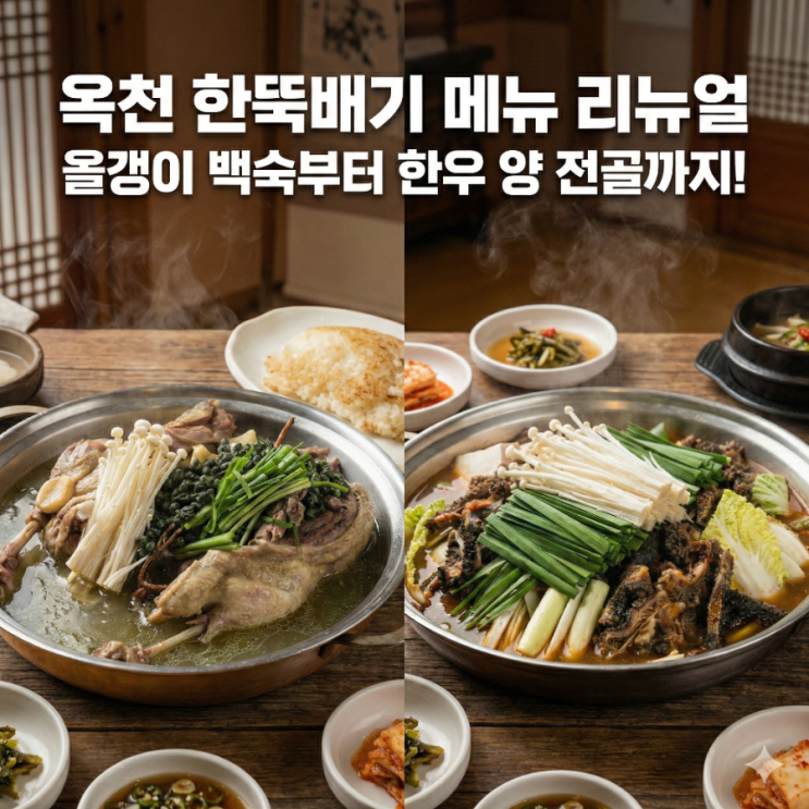 안녕하세요! 옥천 한뚝배기가 새로운 메뉴와 함께 리뉴얼했어요. 금강에서 직접 채취한 올갱이를 사용해 자연의 신선함을 그대로 담아내는 이곳, 어떻게 바뀌었는지 함께 보실까요? 예약 필수! 깊은 맛의 끝판왕 '올갱이 백숙' 이번에 새롭게 정리된 메뉴판에서 가장 눈에 띄는 건 역시 올갱이 백숙 올갱이 오리 백숙(95,000원) 올갱이 토종닭 백숙(85,000원) 금강의 보물이라 불리는 올갱이와 귀한 약재들이 어우러져 국물부터가 예술인데요. 정성이 들어가는 만큼 예약은 필수라고 하니 방문 전 꼭 전화하세요! 한우 양의 쫄깃한 매력, 전골과 무침 한우 양을 활용한 메뉴들도 더욱 알차졌습니다. 한우 양 전골(대 55,000원 / 중 45,....... <img src="https://blogthumb.pstatic.net/MjAyNjAyMTdfMTM1/MDAxNzcxMzE0MDI2MTI4.cmcZW2bzkHqOP1tR1oa82pfxKHBAcWKGqXaKKgt2sYkg.k-RlAoUUhrrXImlLz0ll-VbF_5lufHWZs_Ve2YhL2Jkg.PNG/900%A3%DF1771312680818.png?type=s3" />