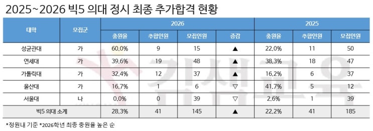 2026정시 의대 충원율 상승 빅5 28.3%, 전국 평균 100% 넘어 2026학년도 정시에서 주요 의대의 충원율이 전반적으로 상승한 것으로 나타남. 빅5 의대의 최종 충원율은 28.3%로 전년보다 높아짐. 추가합격 인원은 41명으로 같았지만 모집인원이 줄어들면서 비율이 상승한 결과. 의대 간 중복합격에 따른 이동뿐 아니라, AI 등 첨단 분야 선호 확산으로 일부 수험생이 다른 학과를 선택했을 가능성도 제기됨. 실제로 만점자 중 일반학과를 택하는 사례가 이어지며 의대 쏠림 현상에도 변화 조짐이 감지됨. 전국 21개 의대를 기준으로는 577명 모집에 585명이 추가합격해 충원율이 100%를 넘김. 일부 대학은 모집 인원을 여러 차례 초과하는 추합이....... <img src="https://blogthumb.pstatic.net/MjAyNjAyMTlfMzQg/MDAxNzcxNDY5NDI2OTYy.tuesdcpsLIkAeHFOisg6Yli7dKEMw8MWw-MnP_bCWfYg.oR7fE3gKeD1nLPK9XaDsN7tWTGGQYdJeMUdCxQeQGyIg.JPEG/1.jpg?type=s3" />