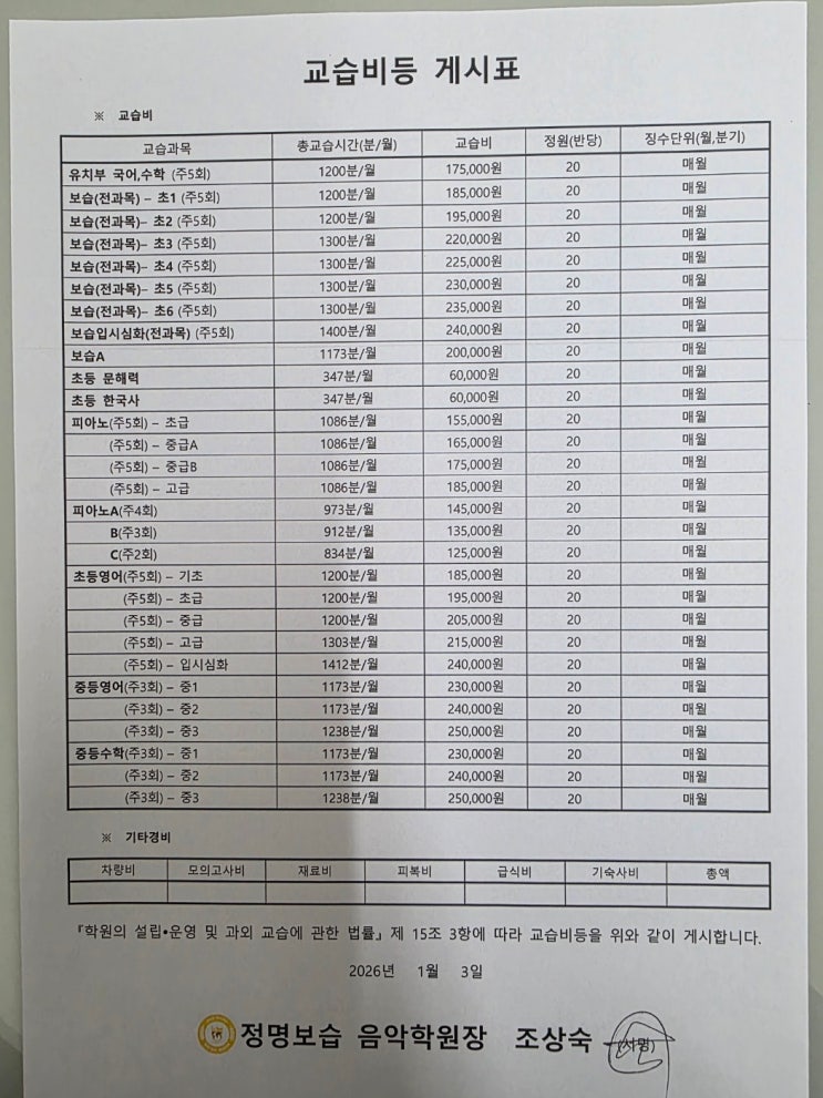 안녕하세요. 교습비 안내드립니다. 남교종 제 2000-65호(재교부) 남교예 제 2000-20호(재교부) 남교입 제 2020-54호 감사합니다. <img src="https://blogthumb.pstatic.net/MjAyNjAxMDlfMTcy/MDAxNzY3OTMxOTczMDU1.6_CeLH5dJfC4jI2qKyWiA-7EuXKZZmWlb21y01tOfNwg.NGC9764AkMimxNkovlsSGnTrH2fZBt1YsRZ_5itNiwQg.JPEG/KakaoTalk_20260109_131152828.jpg?type=s3" />
