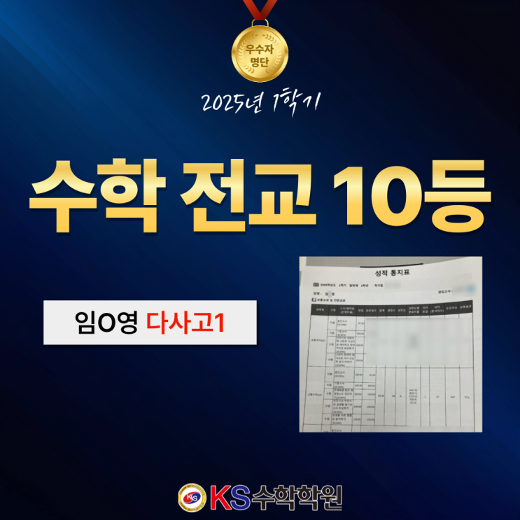 안녕하세요? 인정받는 수학학원! 다사수학학원 KS수학학원입니다! 오늘은 KS수학학원에 재원 중인 재원생들이 학교 내신 시험에서 얼마나 좋은 결과를 얻고 있는지 알려드리려고 합니다~~~ 우리 KS수학학원 재원생들이 2025학년도 1학기에서 아주 눈에 띄는 성과를 보여주었으며 KS수학학원은 항상 결과로 말합니다^^ 학생들과 함께 노력한 결과가 점수로 드러나는 순간은 매번 떨리기도 하고 설레기도 한답니다~~~ 오늘 소개해 드릴 학생은 다사고등학교 1학년 임O영 학생입니다! 2025학년도 1학기에서 수학 전교 10등!!! 다사고등학교 1학년 임O영 학생에게 아낌없는 칭찬과 박수를 보냅니다^^ 우리 임O영 학생 너무 기특하고 자랑스럽습니다^^....... <img src="https://blogthumb.pstatic.net/MjAyNjAxMDlfNzIg/MDAxNzY3OTMwMTM0MDA3.nFPxyhB02HfxJfxA1qi4pawpva7uaC0CIJ9D5aVQQZwg.NJo-LmwZEqZgqn2FDLXw67ZaOjkAKqg3dt18FS5_cOEg.PNG/%BC%BA%C0%FB%BF%EC%BC%F6%C0%DA-%C0%DB%BE%F7-_-1_%BA%B9%BB%E7%BA%BB-010.png?type=s3" />