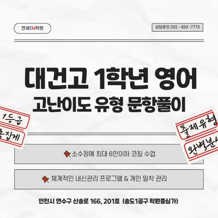 대건고 영어 내신 출제방식 대건고 영어 성적 대건 고등학교 고난도 문항 변형 킬러 유형 대건 고등학교 영어 상위권 변별 포인트 안녕하십니까 송도 고등부 영어학원 연세EM학원입니다. 오늘은 대건 영어 1학년 시험의 "변형 적응력 + 응용형 문제 설계"에 대해서 상위 1등급으로 가기위한 치트키와 꿀팁 위주로 설명드리고자 합니다. 대건고 영어 고난도 유형분석 : 시험의 변별 구조 및 킬러유형 특징 고등 영어 시험의 변별 구조 : 기본 독해력 위에 응용 변형을 추가 대건고는 지문 자체의 난이도가 높다기 보다는 지문을 변형해 묻는 방식이 특징입니다. 원문의 주제는 그대로 유지하되, 문장 구조를 뒤바꾸거나 핵심 어휘를 유....... <img src="https://blogthumb.pstatic.net/MjAyNjAyMTRfMTc4/MDAxNzcxMDczODI5MjQ4.4kxmw5CAiDgCKCX9dwdQocFY2pj7aFnWeYCSsE0L6Zkg.yWQT31uT98qzHkWzCDZ6aNB6GuSyZ42fPgbIQtkL79Mg.PNG/%B4%EB%B0%C7%B0%ED_%BF%B5%BE%EE_%285%29.png?type=s3" />